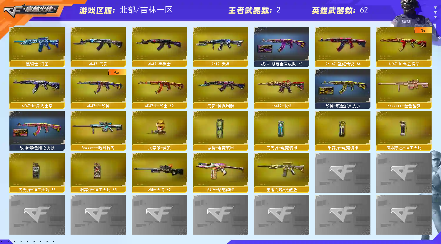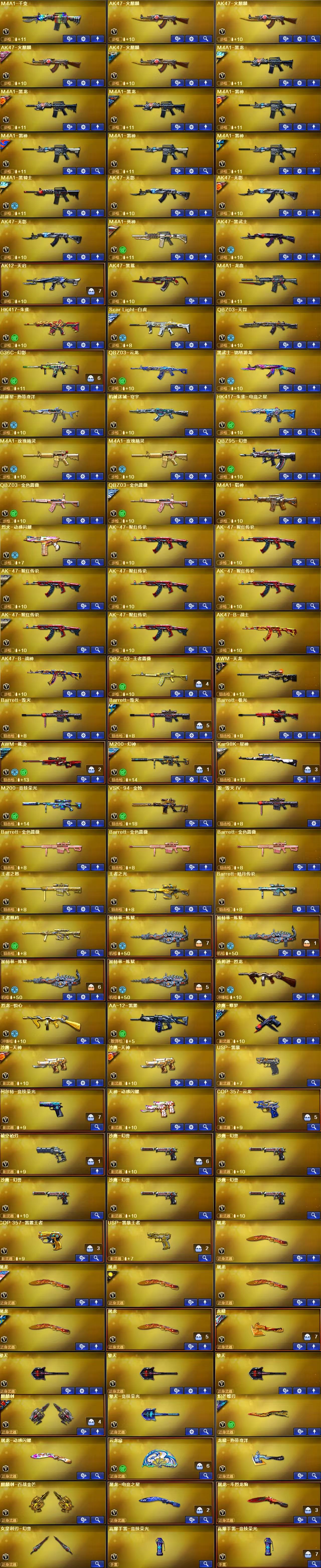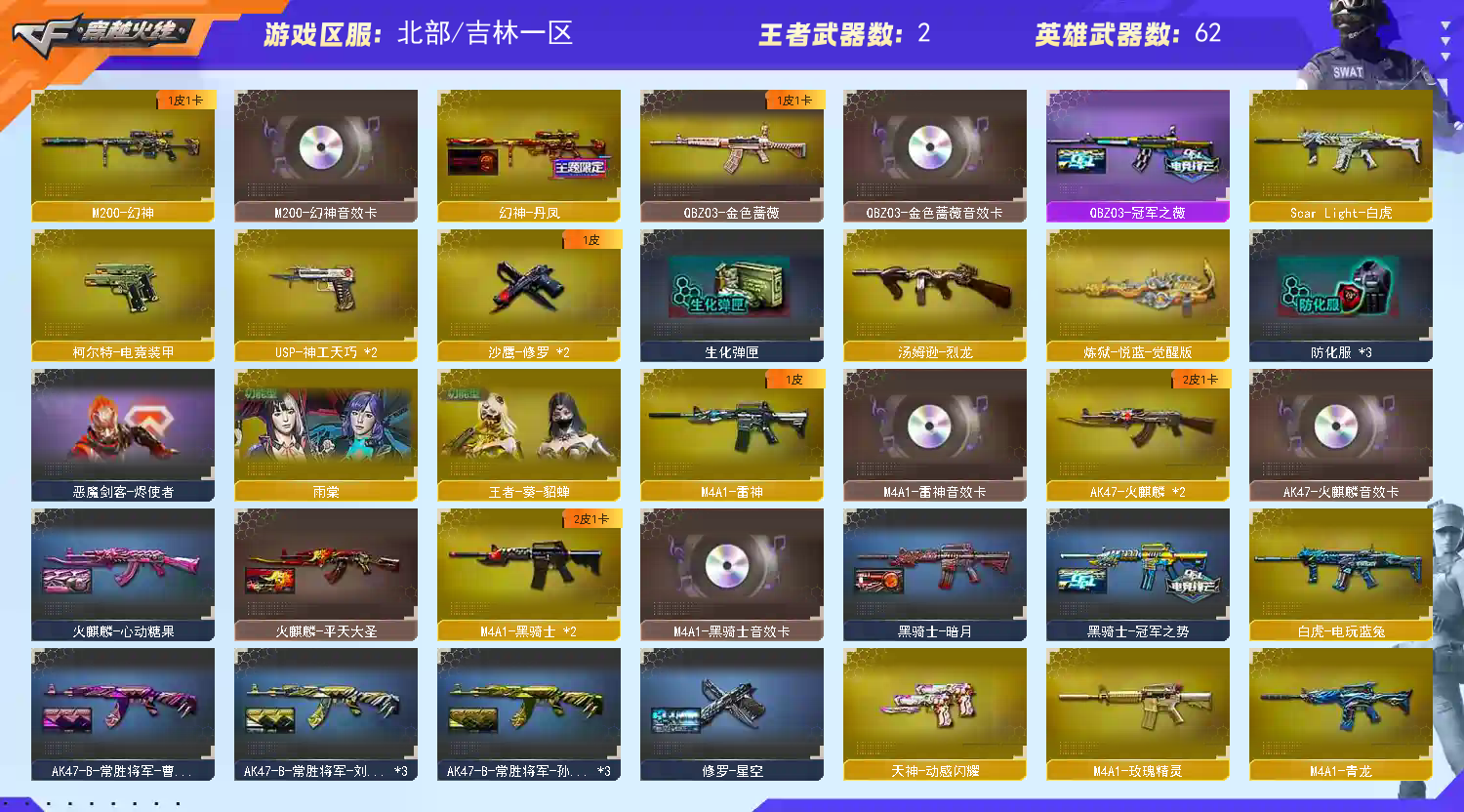 【王者武器】:【炼狱-悦蓝-觉醒版-1,王者之魄-觉醒版-1】 【英雄武器】:【AK12-天启-1,M4A1-黑骑士-2,M4A1-玫瑰精灵-1,AK47-黑武士-1,屠龙-1,AK47-无影-1,麒麟刺-6,AK47-火麒麟-2,AWM-天龙-2,汤姆逊-烈龙-1,沙鹰-修罗-2,M4A1-雷神-1,9A91-烈火-1,M200-幻神-1,恶棍-电竞装甲-1,擎天-竞技荣光-1,柯尔特-电竞装甲-1,烟雾弹-电竞装甲-1,白虎-电玩蓝兔-1,闪光弹-电竞装甲-1,Scar Light-白虎-1,USP-神工天巧-2,高爆手雷-神工天巧-1,闪光弹-神工天巧-3,AK-47-猩红传说-4,无影-神兵利器-1,烟雾弹-神工天巧-5,Barrett-暗月传说-1,QBZ03-金色蔷薇-1,M4A1-仙界-黑骑士-1,火麒麟-灵狐-1,蔷薇青龙-1,修罗-年鹏-1,HK417-朱雀-1,烈火-动感闪耀-1,手雷-动感闪耀-1,天神-动感闪耀-1,屠龙-动感闪耀-1,擎天-1,M4A1-青龙-1,AK47-B-常胜将军-1,AK47-B-身先士卒-1,黑骑士-海王-1,AK47-B-战神-1,AK47-B-战士-2】 【装饰品】:【黑骑士-暗月-1,火麒麟-平天大圣-1,火麒麟-心动糖果-1,黑骑士-冠军之势-1,火麒麟玩偶-1,QBZ03-冠军之薇-1,战神-粉色甜心皮肤-1,战神-流金岁月皮肤-1,AK47-B-常胜将军-曹操-1,AK47-B-常胜将军-刘备-1,AK47-B-常胜将军-孙权-1,修罗-星空-1,幻神-丹凤-1,零-水下丽影玩偶-1】 【角色】:【堕天使,幻影,铁骑,猎狐者,夜玫瑰,灵狐者,嘉年华灵狐,木兰,灵狐者-黄金海岸,雨棠,圣诞潘多拉-X,救世主-X,精英部队,龙儿,新夜玫瑰,潜龙队-X,剑齿虎,王者-葵-貂蝉,北极狐-X,陈龙野-Z,芳心审判者,社长刀锋,灵动武士,职业选手,蜀雪】 【道具】:【超级背包-1,炫彩背包-1,金蛇戒-1,银蛇戒-1,防弹头盔-1,C4工具钳-1,防化服-1,夺命之镰-1,妖姬-1,疯狂宝贝-1,迷雾幽灵-1,生化弹匣-1,步枪弹匣-1,M4A1-雷神音效卡-1,AK47-火麒麟音效卡-1,M4A1-黑骑士音效卡-1,M200-幻神音效卡-1,QBZ03-金色蔷薇音效卡-1,天使之翼-1,绿色巨人-1】 【幻神武器】:【M200-幻神-1】;QBZ03-金色蔷薇,M200-幻神,Scar Light-白虎,