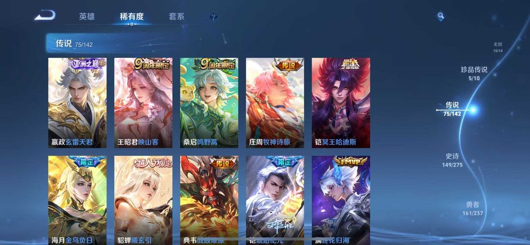 v10、537皮6水4无双、安琪拉-颠倒童话·魔镜、朵莉亚-神骥、遇见神鼓、齐天大圣、白虎志、韩信荣耀典藏、73传说、时之魔女、瑶无双、青丘、九尾、神器明辉仪