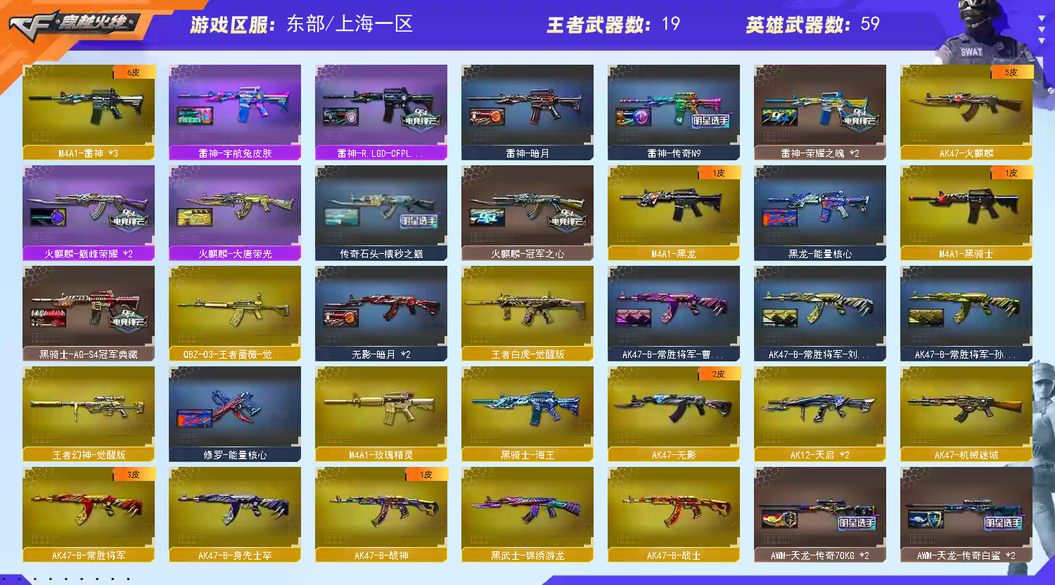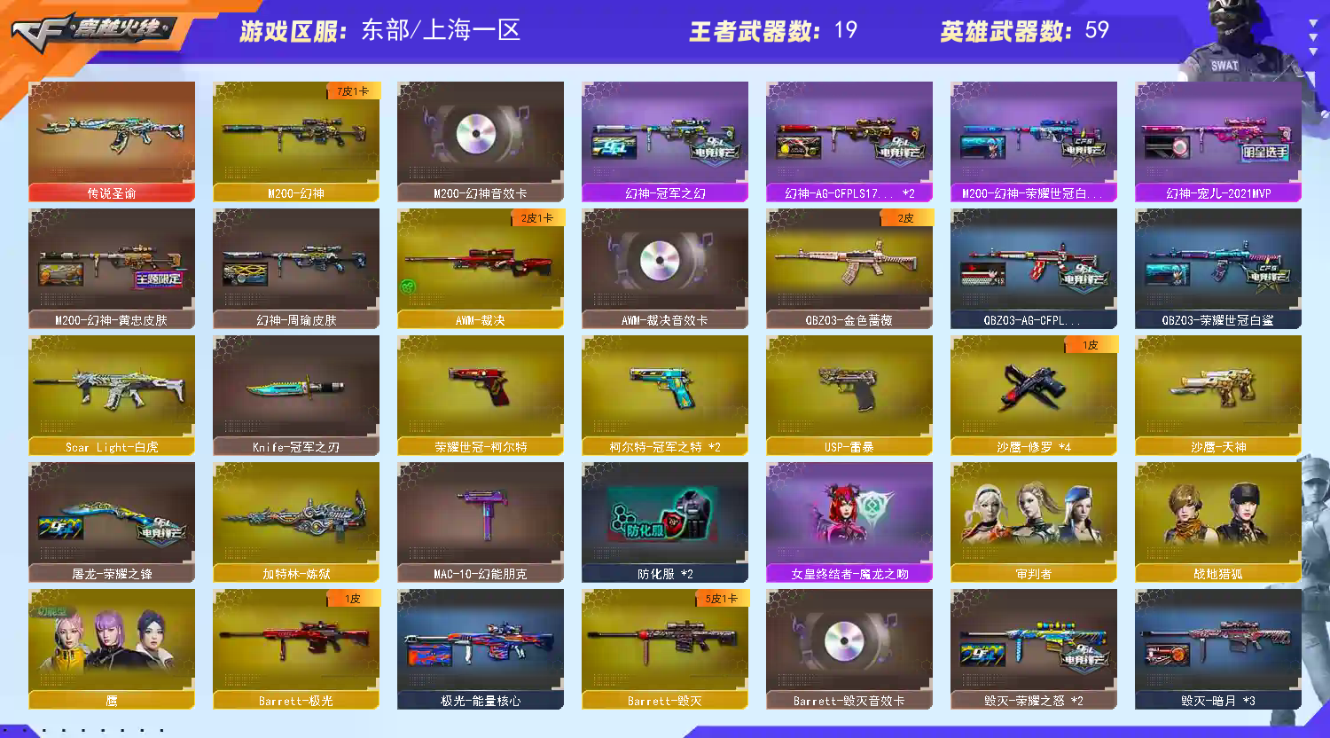 幻神三件套+6皮 Knife-冠军之刃】【M200-幻神+音效卡+幻神-宠儿+幻神-冠军之幻+幻神-荣耀世冠白鲨+幻神-周瑜+幻神-黄忠+幻神-AG-CFPLS17】【王者幻神】【传说圣谕】【王者白虎】【ScarLight-白虎】【QBZ03-金色蔷薇】【裁决+音效卡】【Barrett-毁灭+音效卡+毁灭-荣耀之怒】【极光】【AK47-火麒麟+巅峰荣耀+传奇石头-横秒之巅+火麒麟-冠军之心】【黑龙】【M4A1-雷神+雷神-lgd18冠军+雷神-荣耀之魄】【黑骑士】【无影 天启 机械迷城 龙血 玫瑰精灵】【9手枪 修罗*4 天神 usp雷暴 荣耀世冠-柯尔特 柯尔特-冠军之特*2】【9近战 屠龙*3 龙啸 擎天 麒麟刺】【手雷 雷霆雷 幻灵雷 竞技荣光】【四防 鹰】【幻神音效卡 裁决音效卡 毁灭音效卡;USP-雷暴,荣耀世冠-柯尔特,柯尔特-冠军之特,Knife-冠军之刃,QBZ03-金色蔷薇,M200-幻神,Scar Light-白虎,