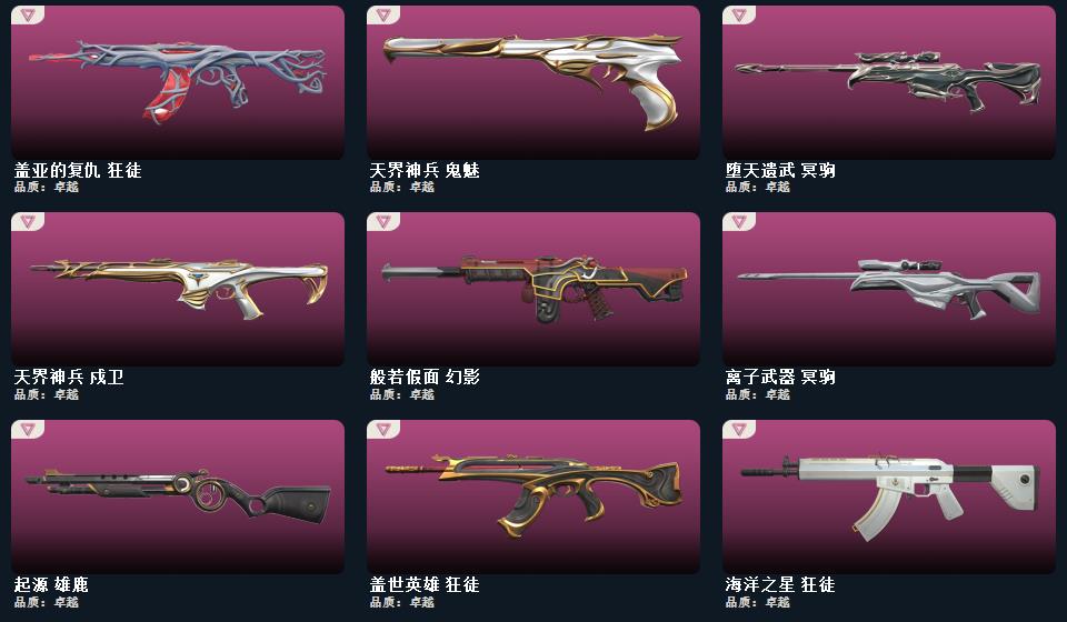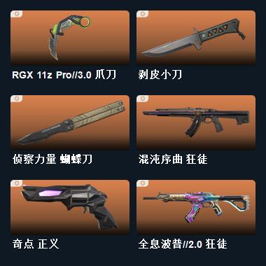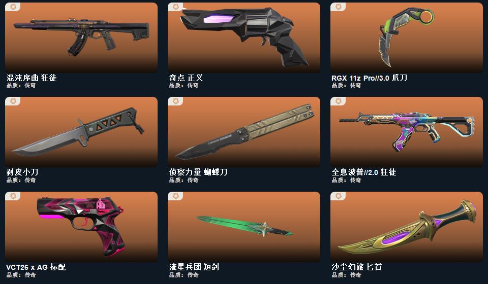 剥皮小刀,RGX 11z Pro//3.0 爪刀,侦察力量 蝴蝶刀,流星兵团 短剑,沙尘幻旅 匕首,VCT26 x AG 标配,星航勇进 獠犬,堕天遗武 冥驹,流星兵团 奥丁,流星兵团 骇灵