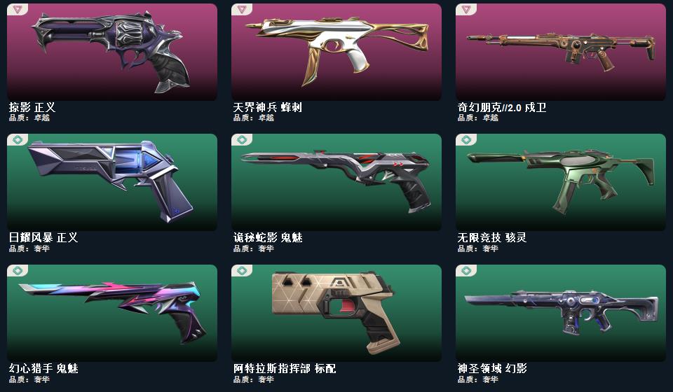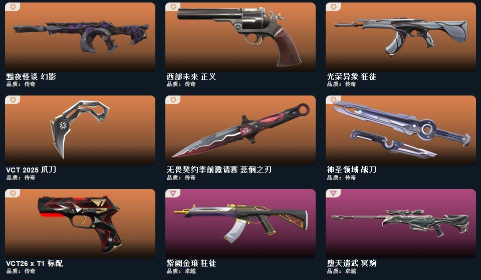 无畏契约季前邀请赛套装,VCT 2025 赛季套装,无畏契约季前邀请赛 悲悯之刃,神圣领域 战刀,VCT 2025 爪刀,蒙太奇 狂怒,天界神兵 蜂刺,奇幻朋克//2.0 戍卫,堕天遗武 冥驹,月球哨兵 雄鹿