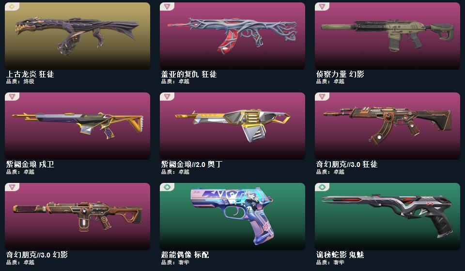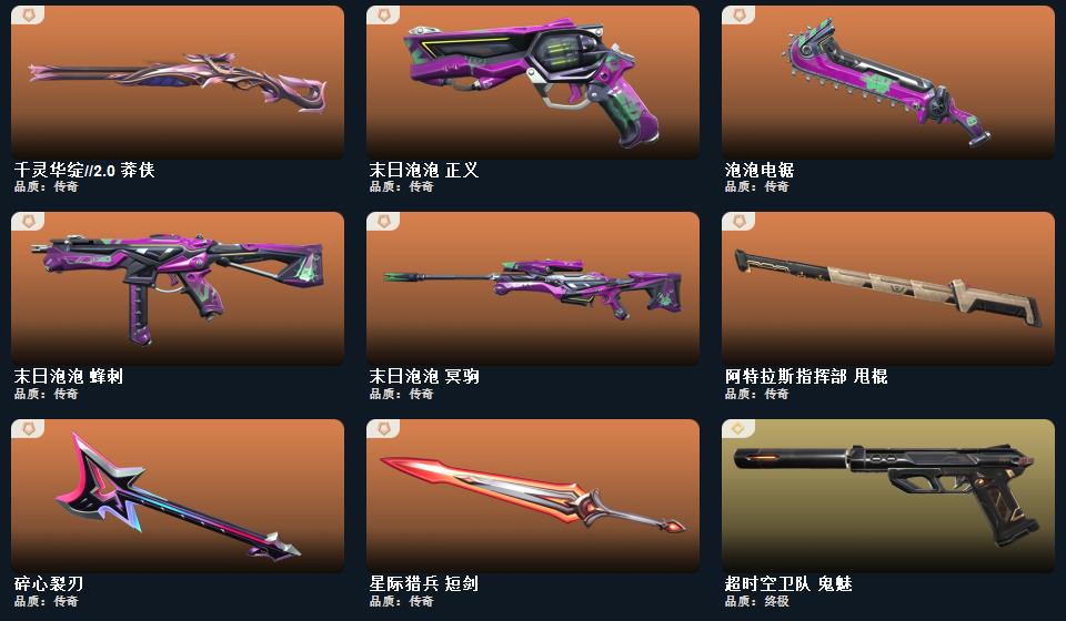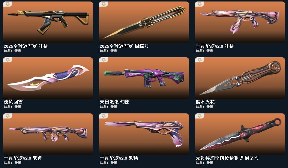 2025全球冠军赛套装,无畏契约季前邀请赛套装,千灵华绽//2.0套装,末日泡泡套装,无畏契约季前邀请赛 悲悯之刃,流风回雪,碎心裂刃,星际猎兵 短剑,2025全球冠军赛 蝴蝶刀,泡泡电锯,魔术火花,阿特拉斯指挥部 甩棍,千灵华绽//2.0 鬼魅,千灵华绽//2.0 莽侠,千灵华绽//2.0 狂徒,甜心猎手 短炮