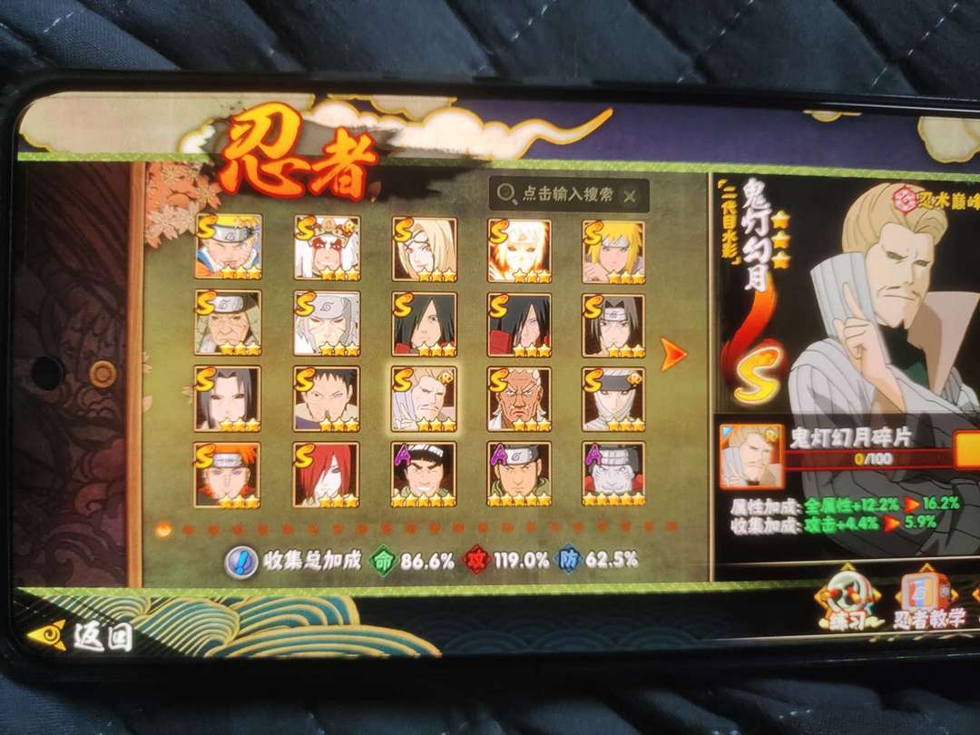17s鬼灯幻月,二代目土影无,忍界大战带土,四代目雷影艾,老玩家账号。