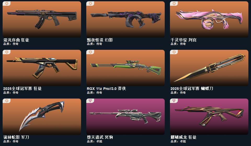 首页 > 租号大厅 > 无畏契约-wegame > wegame/wegame > 2025全球冠军赛套装,2025全球冠军赛 蝴蝶刀,诡秘蛇影 军刀,星际猎兵 标配,折光棱晶 蜂刺,千灵华绽 判官,…