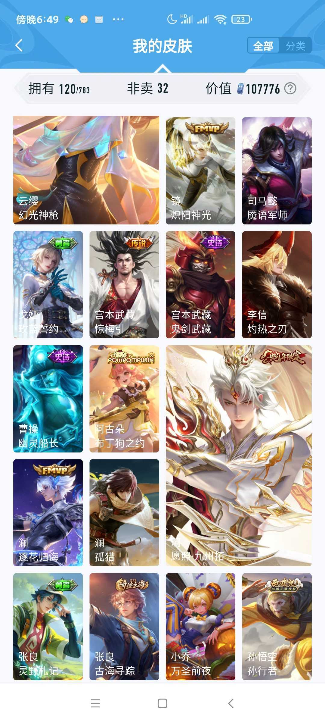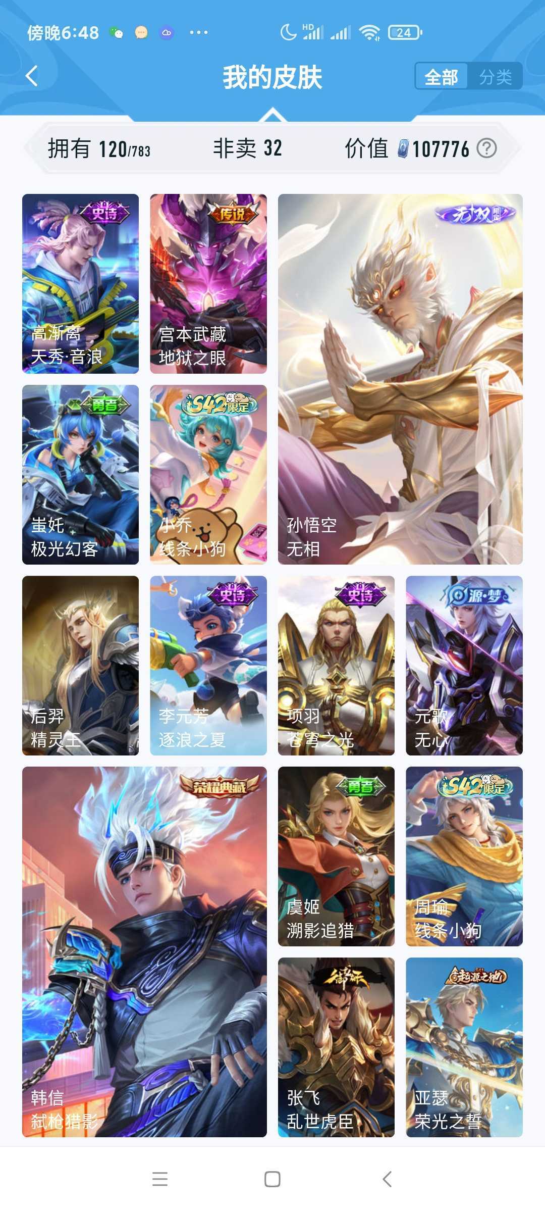 女生号 贵10 多皮肤多传说 别拿那些空号v10来比 要看性价比 貂蝉武则天夏侯惇孙悟空李白鲁班小乔荣耀水晶 妲己九尾无双皮肤 80个传说 473皮肤