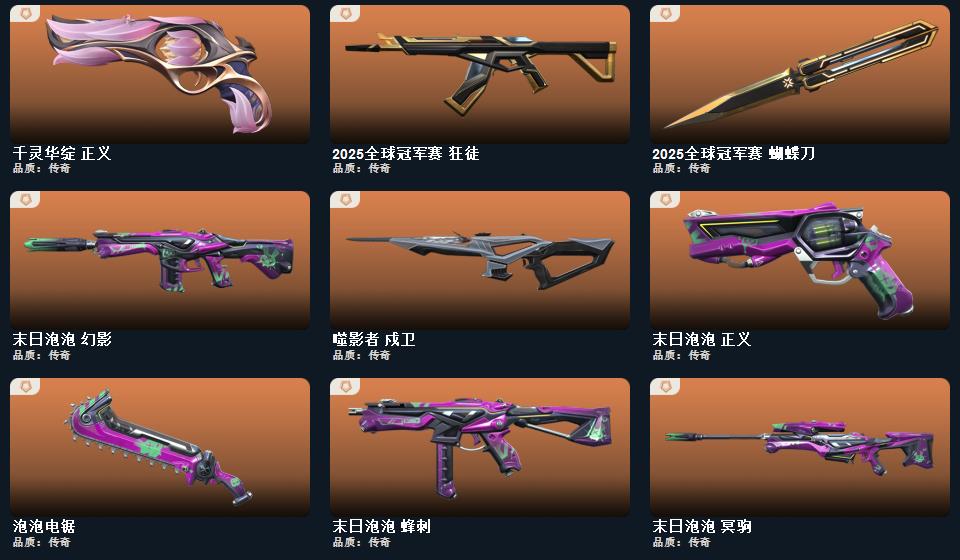2025全球冠军赛套装,末日泡泡套装,蒙太奇 战斧,星际猎兵 短剑,2025全球冠军赛 蝴蝶刀,泡泡电锯,阿特拉斯指挥部 甩棍,蒙太奇 狂怒,超集系统 狂徒,风暴之子 冥驹,蒙太奇 战神