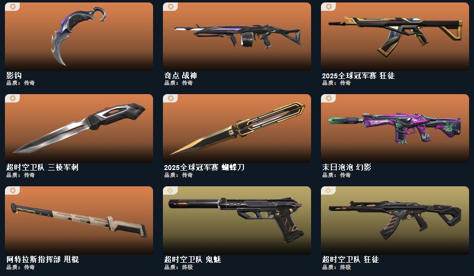 2025全球冠军赛套装,超时空卫队套装,掠影//2.0套装,2025全球冠军赛 蝴蝶刀,阿特拉斯指挥部 甩棍,影钩,超时空卫队 三棱军刺,超集系统 标配,蒙太奇 骇灵,侦察力量 幻影,超集系统 飞将,太空穿梭 战神