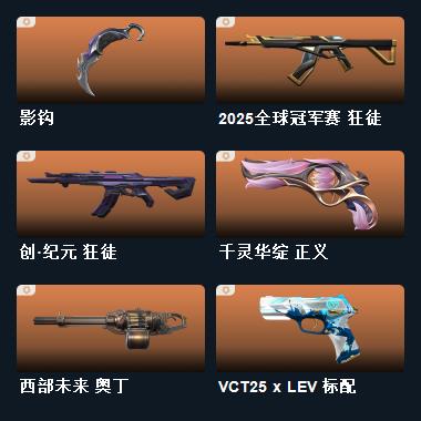2022全球冠军赛套装,无畏契约季前邀请赛套装,星际猎兵 短剑,阿特拉斯指挥部 甩棍,影钩,神圣领域 战刀,蒙太奇 狂怒,瑰梦艺语 骇灵,星际猎兵 判官,瑰梦艺语 狂徒,光环序列 冥驹,光环序列 战神