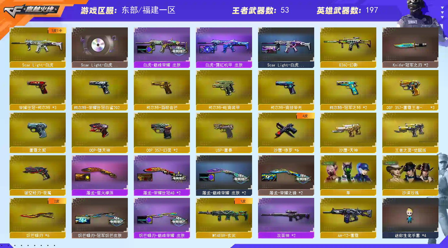 账号充值10w➕ 开挂导致封号必起诉维权 请租客老板自重 尊耀超核➕超核名片➕超核皮肤 顶爆破➕顶生化 ⭐️爆破🔥6️⃣传说 神威莲花➕传说女帝➕传说艾莉莎➕神威天绫➕传说夜影➕传说暗裔 3️⃣幻神➕音效卡➕8皮(白鲨23➕宠儿➕ng➕冠幻➕ag➕白鲨➕电流➕黄忠) ⭐️生化🔥炼狱奇幻国王狮子➕6️⃣烈龙盘龙➕斯太尔蝴蝶➕2️⃣斯太尔枪娘➕2️⃣个黄金猫猫白鲨➕4️⃣炼狱带音效卡➕异变清道夫➕全生化皮肤 6️⃣把炽芒蝶刃(冠军炽芒➕巅峰荣耀) 8️⃣柯尔特(3荣耀柯尔特➕2冠特➕白鲨柯尔特➕百战柯尔特➕竞技柯尔特) 7️⃣cop(3雷霆王者➕2幻灵➕堕天神➕雷霆)➕usp雷暴 qbz5️⃣皮(冠军之薇➕白鲨➕ag➕巅峰➕枪娘➕音效 白虎3️⃣皮(巅峰荣耀➕霓虹机甲➕暗星)➕音效 雷神2️⃣0️⃣皮(十周年臻藏版➕荣耀➕冠军等) 星神4️⃣皮(枪娘➕漫游➕璀璨皮➕战甲)➕98k量子之心 裁决三件套(流光➕异化之源) g36c幻影➕加利尔ace➕玄武➕2️⃣冠军之刃➕金色id ⭐️角色:20➕英雄角色➕50➕4防角色➕全女团(晴雅➕云悠悠➕岚兮儿➕雾蒙蒙➕枪娘樱➕关小雨)生化⭐️沙漠玫瑰⭐️隼➕鹰➕春➕雨棠➕荒漠琉璃➕月兔特工➕隐➕团团➕几十个王者角色(基本全开4防);USP-雷暴,荣耀世冠-柯尔特,柯尔特-荣耀世冠白鲨2023,柯尔特-冠军之特,炽芒蝶刃,Knife-冠军之刃,沙漠玫瑰,