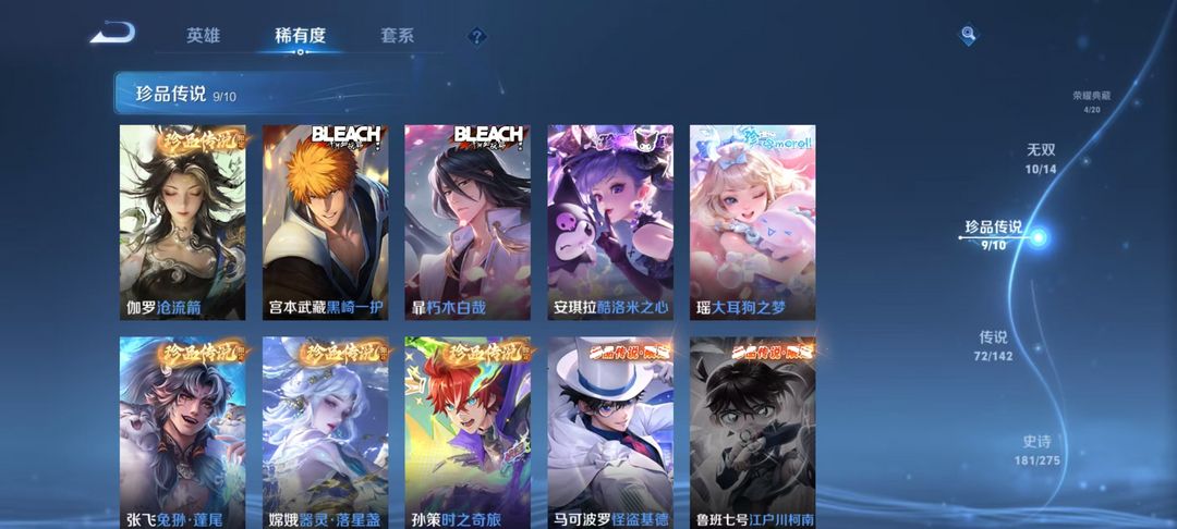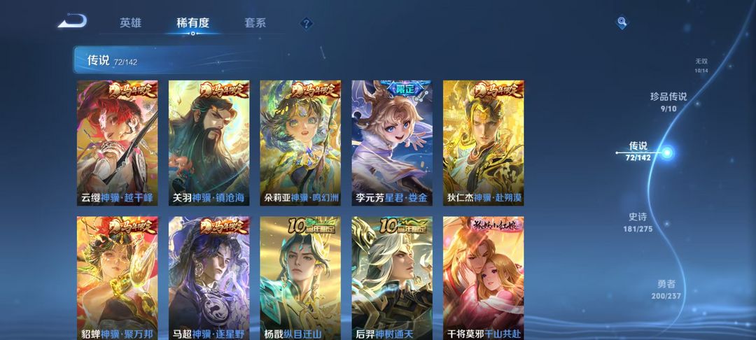 v10、537皮6水4无双、安琪拉-颠倒童话·魔镜、朵莉亚-神骥、遇见神鼓、齐天大圣、白虎志、韩信荣耀典藏、73传说、时之魔女、瑶无双、青丘、九尾、神器明辉仪