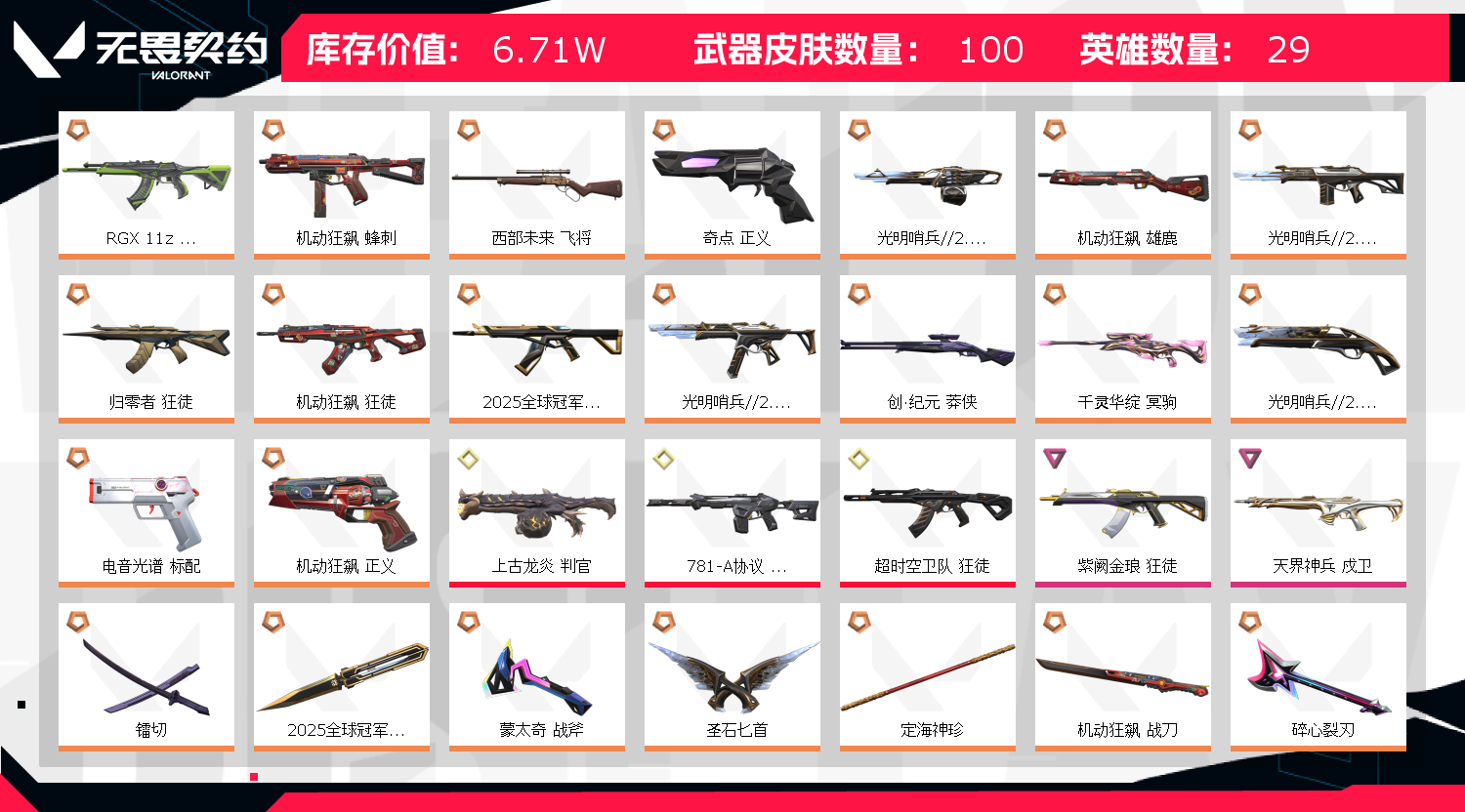 郑重声明:若出现 账号封禁/毁号等情况,本人商户多年,所属账号已在郑州市派出所备案,经过网络财产备案价值! 使用外挂脚本导致游戏账号封禁直接向平台提取ip地址!一经发现直接报警处理立案追责,根据账号价值追究其法律责任! 请租客文明游戏,不要开挂或挂机!切勿心存侥幸!因无畏契约检测严格,为防止后台插件导致封号,上号前请务必重启电脑! 注意事项:出现冻结,我们看到后会及时解冻。等5-10分钟重新登陆即可 1.登陆界面稍等2分钟会上去(自动登录)老板不要着急,一次不行多来几次wegame界面要耐心等2分钟 2.密令会自动输入如果一次不成功多来几次。 3..进入wegame后到弹短信验证处,关闭掉,重新下载无畏契约这个游戏即可成功上号,记住。这个方法百分百上号成功!就是进入wegame重新下载无畏契约游戏 !!!百分百成功!! 4.请及时续租不要挂机,如果不需要续租了,临近结束不要再开赛,所以请及时续租,导致禁赛的一律拉黑 。 5.祝老板玩的愉快,喜欢可以收藏关注;镭切,上古龙炎 判官,紫阙金琅 狂徒,RGX 11z Pro 狂徒,天界神兵 戍卫,机动狂飙 蜂刺,西部未来 飞将,
