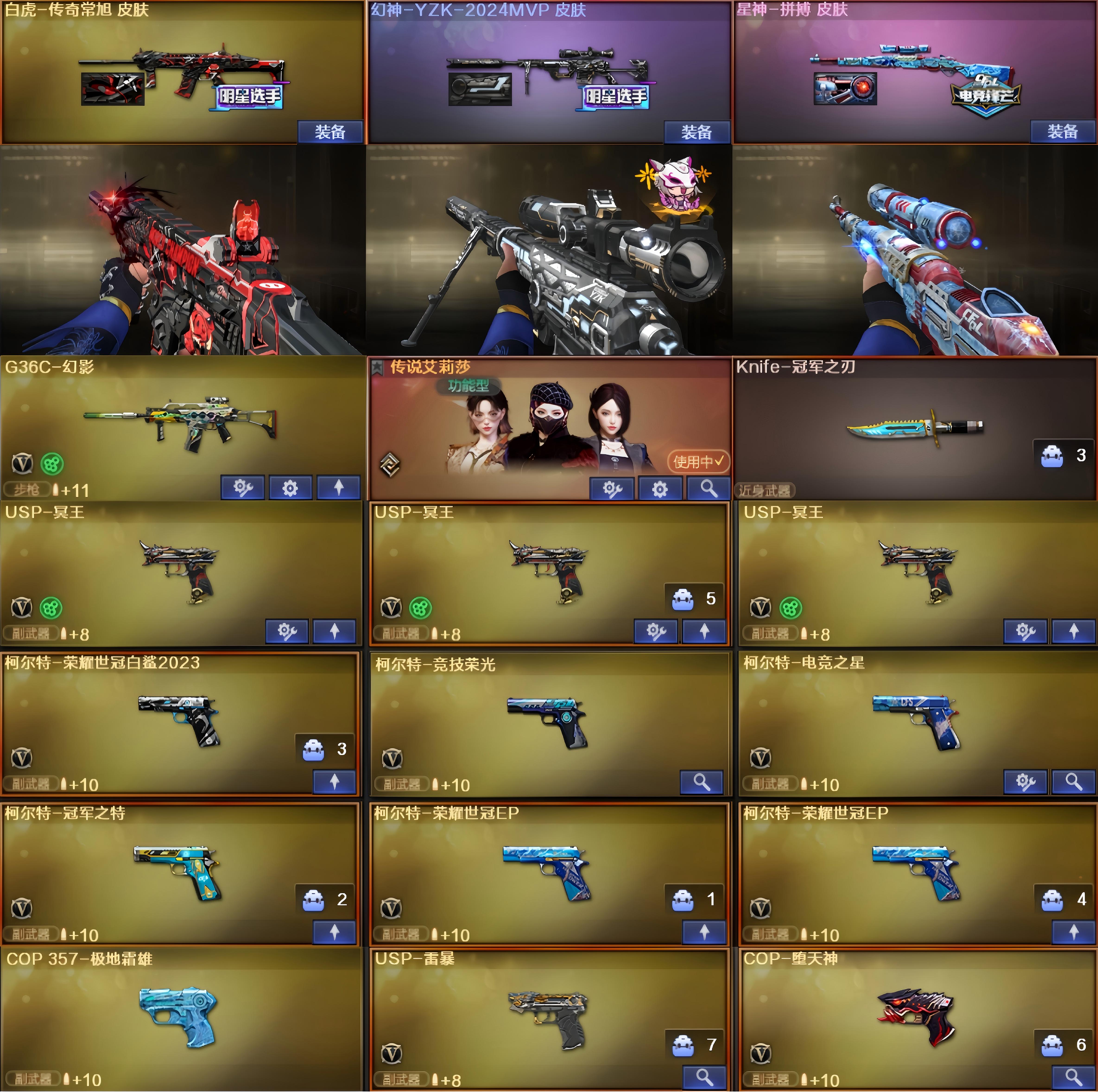 首发幻神YZK白虎常旭❤传说艾丽莎6柯尔特❤G36C幻影裁决三件套❤QBZ宠儿冠军皮肤;USP-雷暴,柯尔特-荣耀世冠白鲨2023,柯尔特-冠军之特,炽芒蝶刃,Knife-冠军之刃,电竞教官-云悠悠,传说艾莉莎,