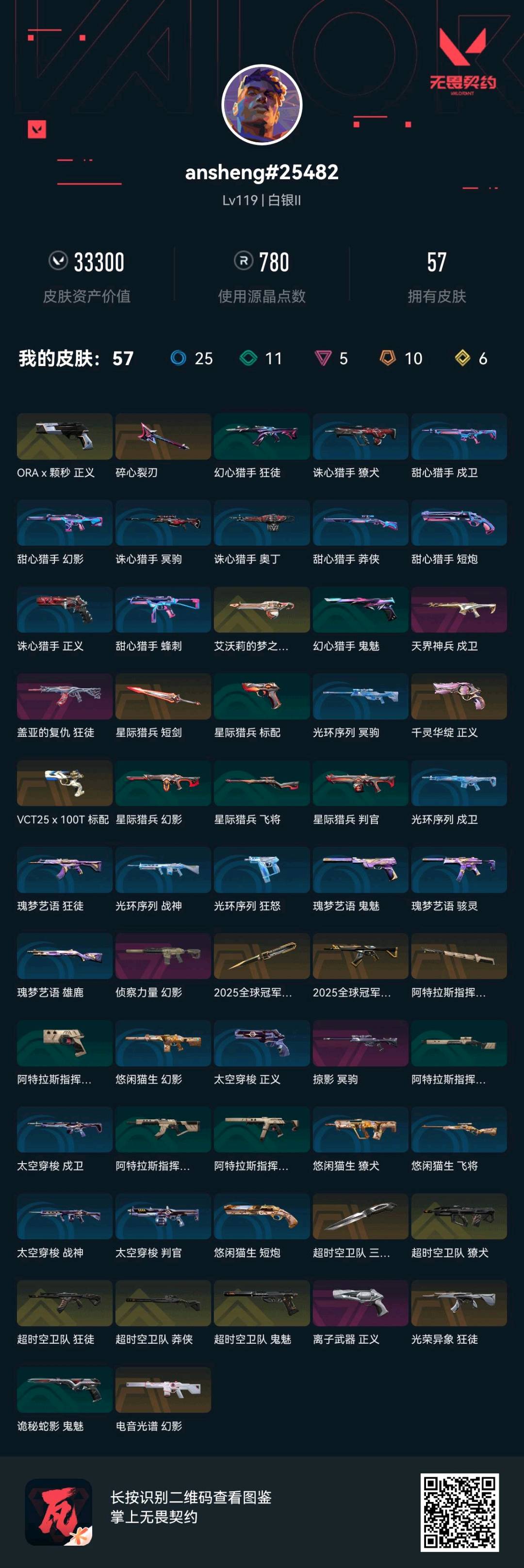 首页 > 租号大厅 > 无畏契约-wegame > wegame/wegame > ✨【Lv120全皮肤号】3.3W资产/25冠军/超时空套系/58皮肤/6把终极/10把传奇