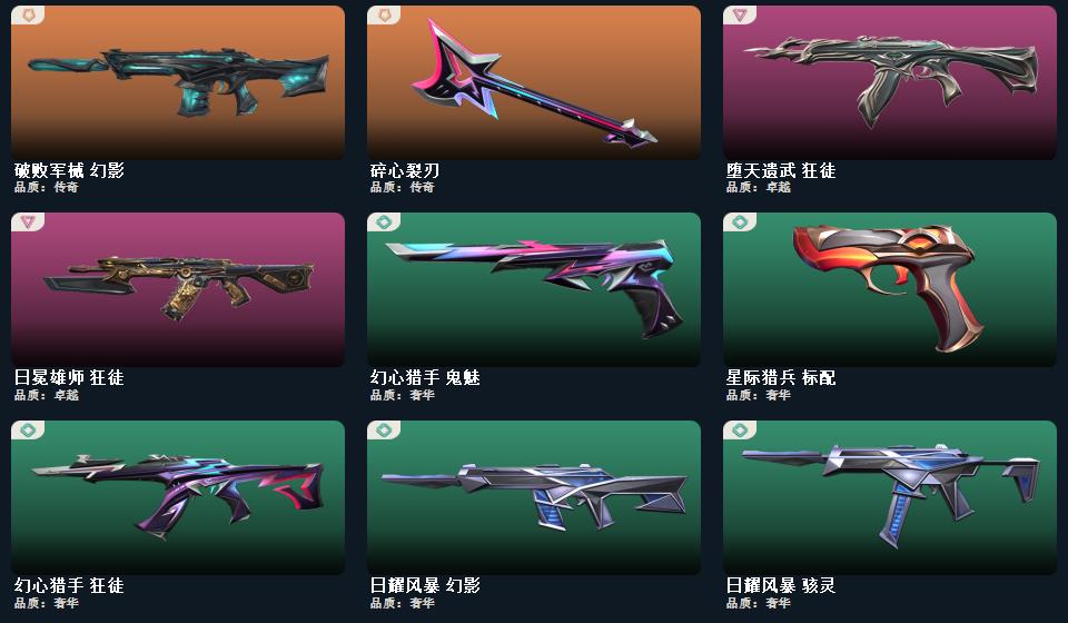 幻心猎手 鬼魅,甜心猎手 短炮,诛心猎手 正义,千灵华绽//2.0 鬼魅,星际猎兵 标配,甜蜜战术 鬼魅,幻语魔咒 狂怒 日冕雄师 狂徒,幻心猎手 狂徒,诛心猎手 獠犬,甜心猎手 戍卫,甜心猎手 幻影,千灵华绽//2.0 狂徒,幻语魔咒 獠犬,日耀风暴 幻影,2022全球冠军赛 幻影,破败军械 幻影,甜蜜战术 戍卫,堕天遗武 狂徒 诛心猎手 冥驹,甜心猎手 莽侠,千灵华绽//2.0 莽侠,甜蜜战术 冥驹,幻语魔咒 飞将