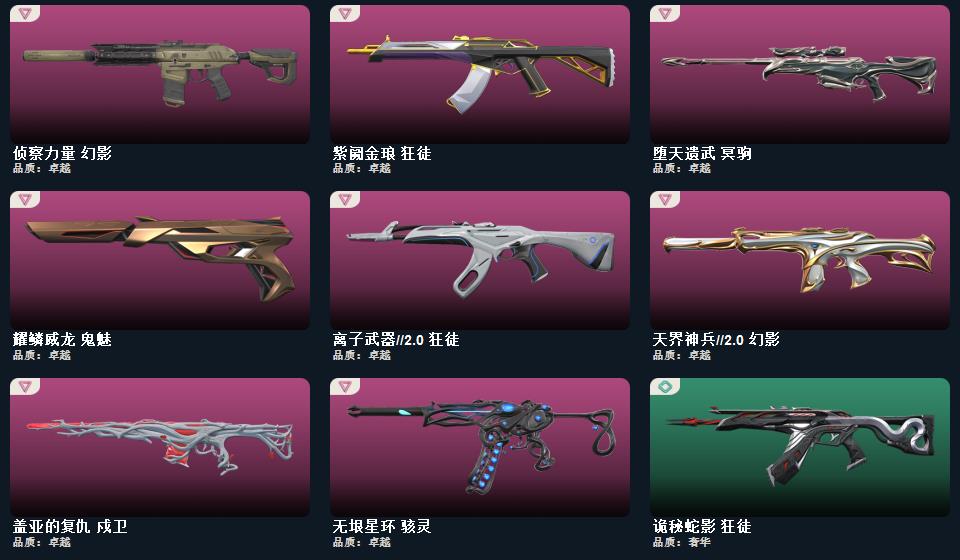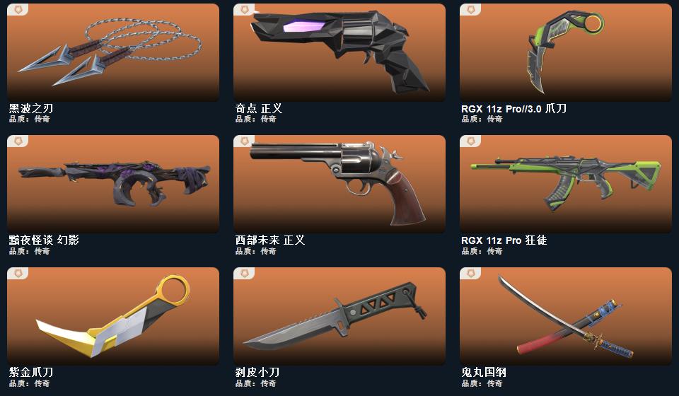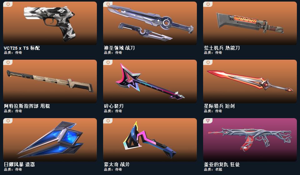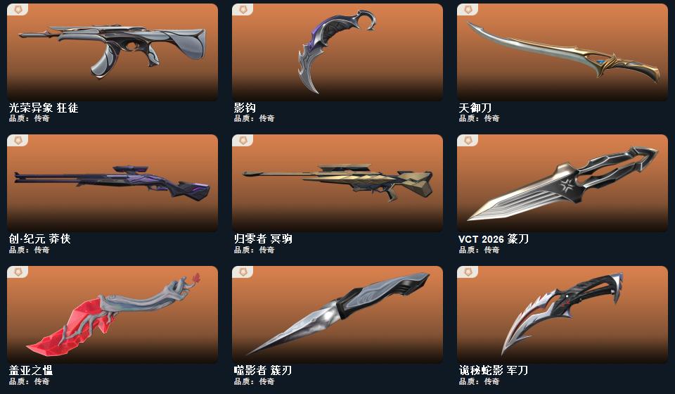VCT 2026 篆刀,天御刀,蒙太奇 战斧,噬影者 簇刃,盖亚之愠,碎心裂刃,紫金爪刀,星际猎兵 短剑,阿特拉斯指挥部 甩棍,影钩,RGX 11z Pro//3.0 爪刀,日耀风暴 遗器,黑波之刃,诡秘蛇影 军刀,神圣领域 战刀,剥皮小刀,荒土机兵 热能刀,鬼丸国纲 盖亚的复仇 戍卫,超集系统 狂徒,蒙太奇 幻影,风暴之子 戍卫,黯夜怪谈 幻影,甜心猎手 幻影,离子武器//2.0 狂徒,甜心猎手 戍卫,幻心猎手 狂徒,诛心猎手 獠犬,瑰梦艺语 狂徒,光环序列 戍卫,星际猎兵