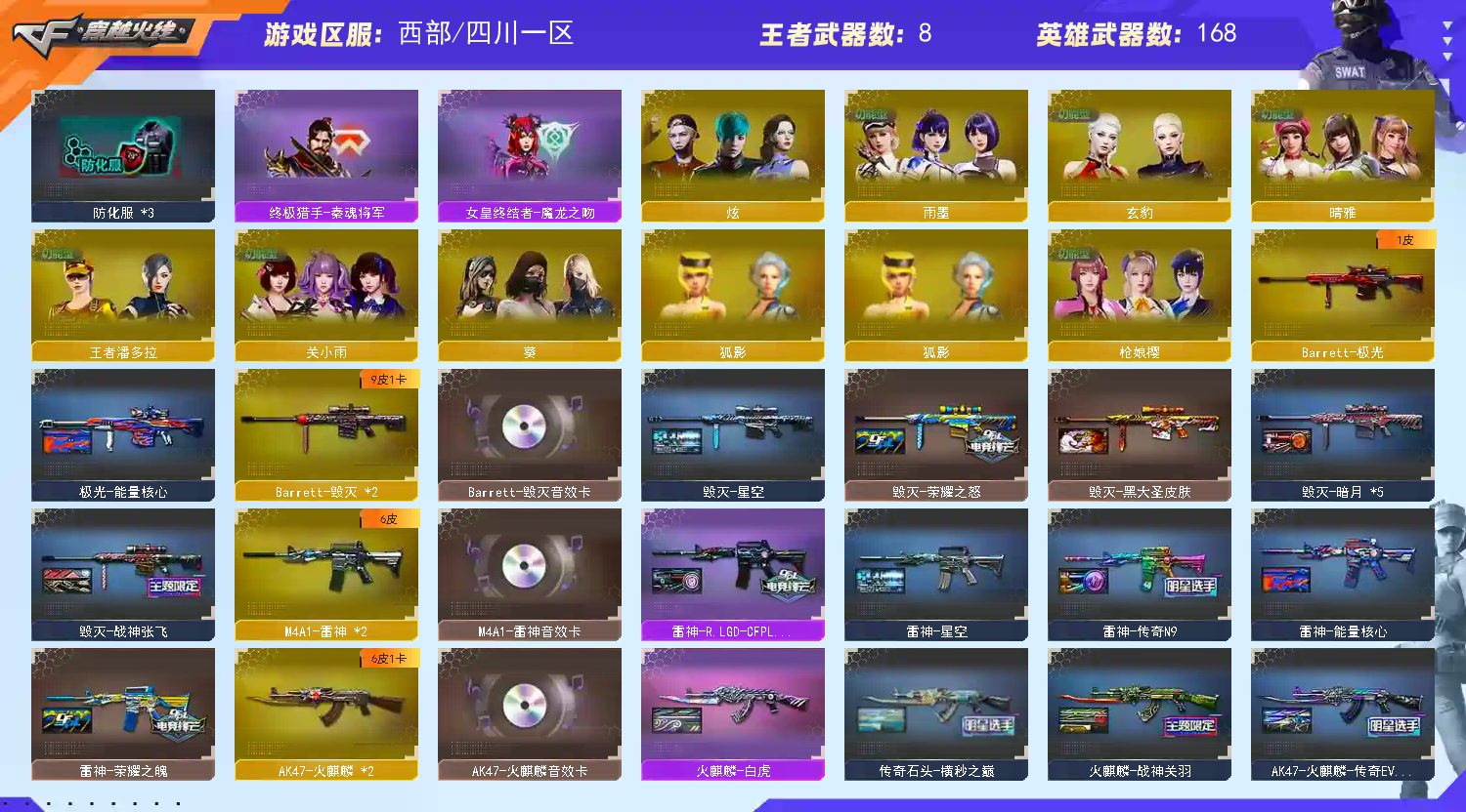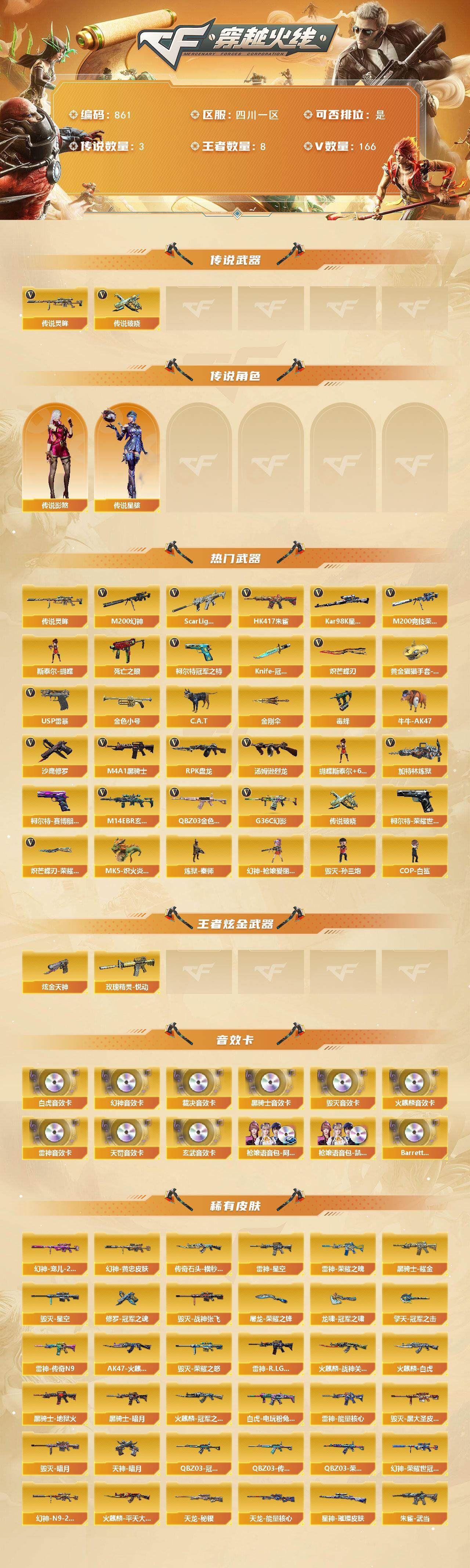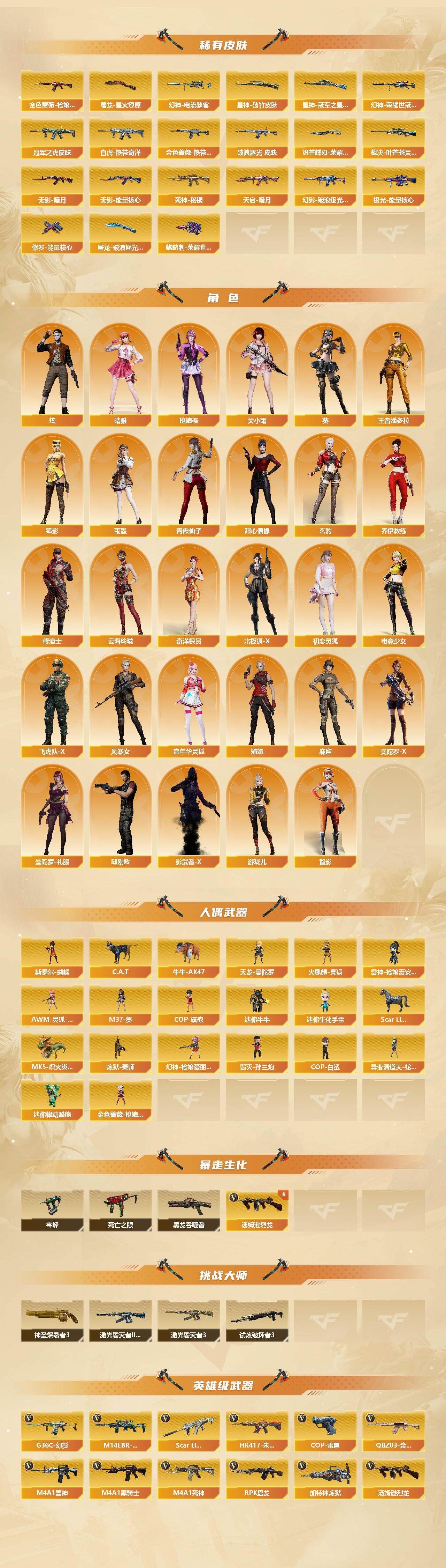 【传说星骇,传说影煞】【传说灵眸,传说破晓*2】【G36C-幻影,QBZ03-金色蔷薇,M14EBR-玄武,Scar Light-白虎,HK417-朱雀,M200-幻神,柯尔特-荣耀世冠白鲨2023,M200-竞技荣光,死亡之眼*2,柯尔特-冠军之特*2,Kar98K-星神,金色小号,C.A.T,毒蜂,牛牛-AK47,M4A1-黑骑士,汤姆逊-烈龙*7,RPK-盘龙,加特林-炼狱,斯泰尔-蝴蝶,MK5-炽火炎龙,炼狱-秦师,幻神-枪娘爱丽丝,毁灭-孙三炮,COP-白鲨,USP-雷暴,柯尔特-赛博朋克,Knife-冠军之刃,炽芒蝶刃*2,炽芒蝶刃-荣耀世冠白鲨2023 皮肤,黄金猫猫手套-白鲨,金刚伞】【AK47-火麒麟,M4A1-雷神*2,M4A1-黑骑士,M4A1-死神,AK47-黑武士,AK47-雷暴,HK417-朱雀,Scar Light-白虎,M14EBR-玄武,QBZ03-天罚*2,G36C-幻影,QBZ03-云龙,超新星-热带奇洋,FAMAS G2-天戎,SCAR Light-玄豹,QBZ03-金色蔷薇,M4A1-猎神,王者之武-觉醒版,王者之烈-觉醒版,王者芳薇-觉醒版,AWM-天龙*2,Barrett-毁灭*2,Barrett-极光,AWM-裁决,M200-幻神,Kar98K-星神,M200-竞技荣光,VSK-94-金蚀,王者之怒-觉醒版,RPK-盘龙,加特林-炼狱,炼狱-悦蓝-觉醒版*2,悦蓝-惊涛骇浪-觉醒版,汤姆逊-烈龙*7,烈龙-云海游龙,AA-12-雷霆,沙鹰-修罗*2,沙鹰-天神,USP-雷暴,COP-雷霆,柯尔特-冠军之特*2,柯尔特-荣耀世冠白鲨2023,柯尔特-竞技荣光,COP 357-云龙*3,Anaconda-玄豹,USP-冥王,屠龙*2,龙啸,擎天,麒麟刺*2,擎天-竞技荣光,炽芒蝶刃*2】【蝴蝶斯泰尔+6烈龙,1白虎,1黑骑士,6烈龙,1盘龙,1炼狱,1蝴蝶斯泰尔】【M200-幻神音效卡,AK47-火麒麟音效卡,M4A1-雷神音效卡,M4A1-黑骑士音效卡,Barrett-毁灭音效卡,AWM-裁决音效卡,Scar Light-白虎音效卡,枪娘语音包-阿敏,枪娘语音包-凯萨林,QBZ03-天罚音效卡*2,M14EBR-玄武音效卡,Barrett-碧霄极光音效卡*2】【M200-幻神-黄忠皮肤,幻神-宠儿-2021MVP,M200-幻神-荣耀世冠白鲨,M200-幻神-N9-2022MVP,幻神-电流骇客 皮肤,幻神-荣耀世冠白鲨2023 皮肤,白虎-电玩粉兔皮肤,ScarLight-白虎-冠军之虎皮肤,白虎-热带奇洋 皮肤,QBZ03-冠军之薇,QBZ03-传奇宠儿,金色蔷薇-枪娘阿敏 皮肤,QBZ03-荣耀世冠白鲨,金色蔷薇-热带奇洋 皮肤,金色蔷薇-破浪逐光 皮肤,裁决-叶芒苍灵 皮肤,星神-璀璨皮肤,星神-破竹皮肤,Kar98K-星神-冠军之星皮肤,雷神-能量核心,雷神-荣耀之魄,雷神-星空,雷神-传奇N9,雷神-R.LGD-CFPLS18冠军,火麒麟-冠军之心,AK47-火麒麟-传奇EVEN,火麒麟-战神关羽,传奇石头-横秒之巅,火麒麟-平天大圣,火麒麟-白虎,毁灭-暗月*5,毁灭-荣耀之怒,毁灭-星空,毁灭-战神张飞,HK417-朱雀-武当,幻影-破浪逐光 皮肤,屠龙-破浪逐光 皮肤,龙啸-冠军之啸,擎天-冠军之击,麒麟刺-荣耀世冠白鲨,炽芒蝶刃-荣耀世冠白鲨2023 皮肤】【葵,炫,关小雨,枪娘樱,晴雅,雨墨,玄豹,王者潘多拉,狐影,奇洋探员,乔伊教练,云海玲珑】【人偶武器:幻神-枪娘爱丽丝,炼狱-秦师,COP-白鲨,毁灭-孙三炮,天龙-曼陀罗,火麒麟-灵狐,雷神-枪娘蕾安娜,金色蔷薇-枪娘阿敏,MK5-炽火炎龙,异变清道夫-蛇影双骄,迷你律动酷熊,斯泰尔-蝴蝶,Scar Light-马枪,AWM-灵狐-15周年嘉年华,M37-葵,COP-旗袍,C.A.T,牛牛-AK47,迷你牛牛*2,迷你生化手雷*3】【BS战队炫彩背包,CFS限定背包,EP战队炫彩背包,热带奇洋炫彩背包,超级背包*2,终极猎手-秦魂将军,女皇终结者-魔龙之吻,救世主-黑桃战神,绿色巨人,灵魂忍者,迷雾幽灵,生化弹匣,夺命之镰,防化服*3,金色流光-枪王排位*2,星辰流光-枪王排位,枪王排位28赛季金色流光,EP战队名片,EP战队喷图,EP战队击杀图标,C4-红龙,防弹头盔*4,防弹衣*4,C4工具钳*4,手雷包*4】;USP-雷暴,柯尔特-荣耀世冠白鲨2023,柯尔特-冠军之特,炽芒蝶刃,Knife-冠军之刃,传说影煞,传说星骇,