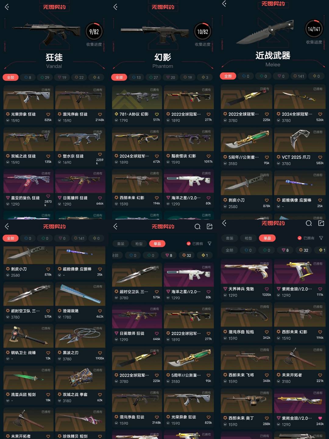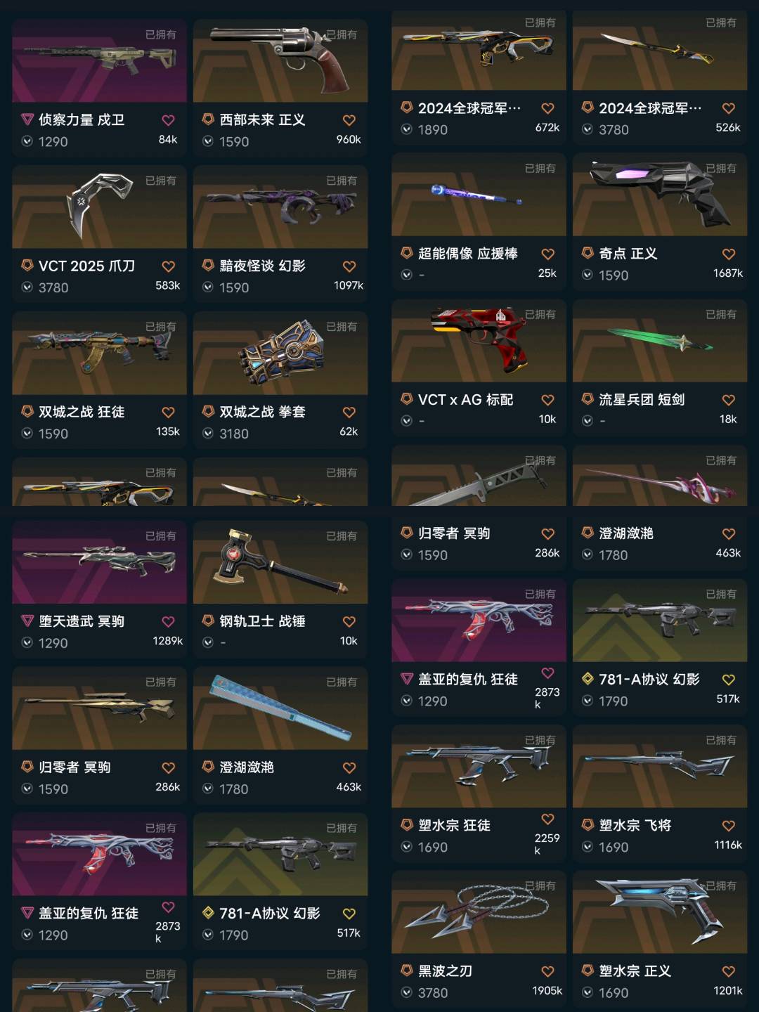 开挂必起诉;西部未来 奥丁,黑波之刃,5周年//公测重制版 苍龙之刃,剥皮小刀,VCT 2025 爪刀,盖亚的复仇 狂徒,混沌序曲 狂徒,