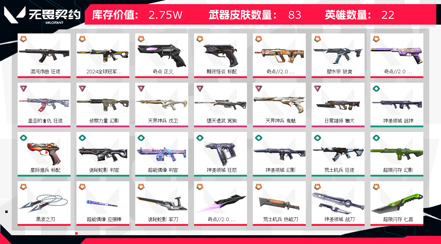 首页 > 租号大厅 > 无畏契约-wegame > wegame/wegame > 黑波奇点蝴蝶刀,24冠侦查幻影,混沌盖亚威龙奇点ak,天界戍卫鬼魅,奇点正义,堕天大狙,雄狮缭犬等