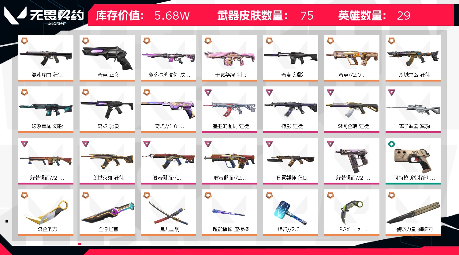首页 > 租号大厅 > 无畏契约-wegame > wegame/wegame > 5.5w库存/奇点//2.0全套/鬼丸国纲/紫金爪刀/混沌序曲 狂徒/天玄刀/双城之战 狂徒