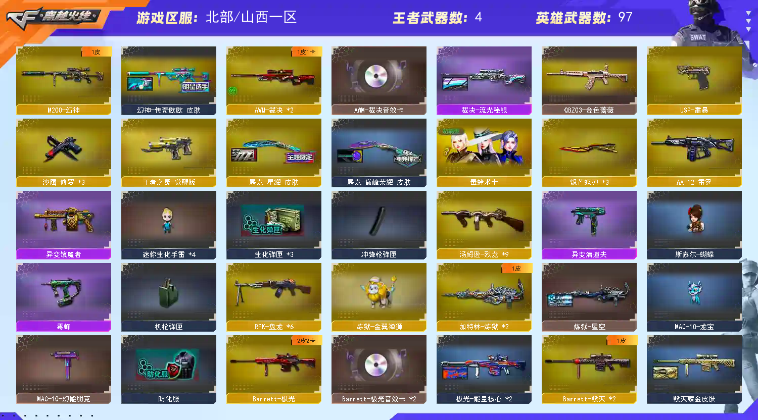 【4防毒蝰】❤️3把炽芒蝶刃+炼狱金翼禅狮(赋予)+龙宝斯太尔蝴蝶丨异变清道夫镇魔者❤️极光裁决带卡;USP-雷暴,炽芒蝶刃,RPK-盘龙,QBZ03-金色蔷薇,M200-幻神,