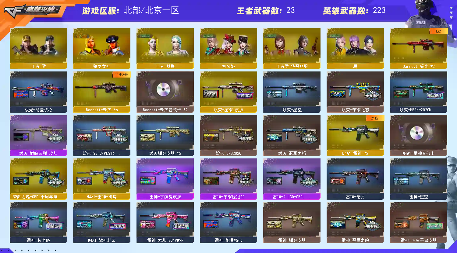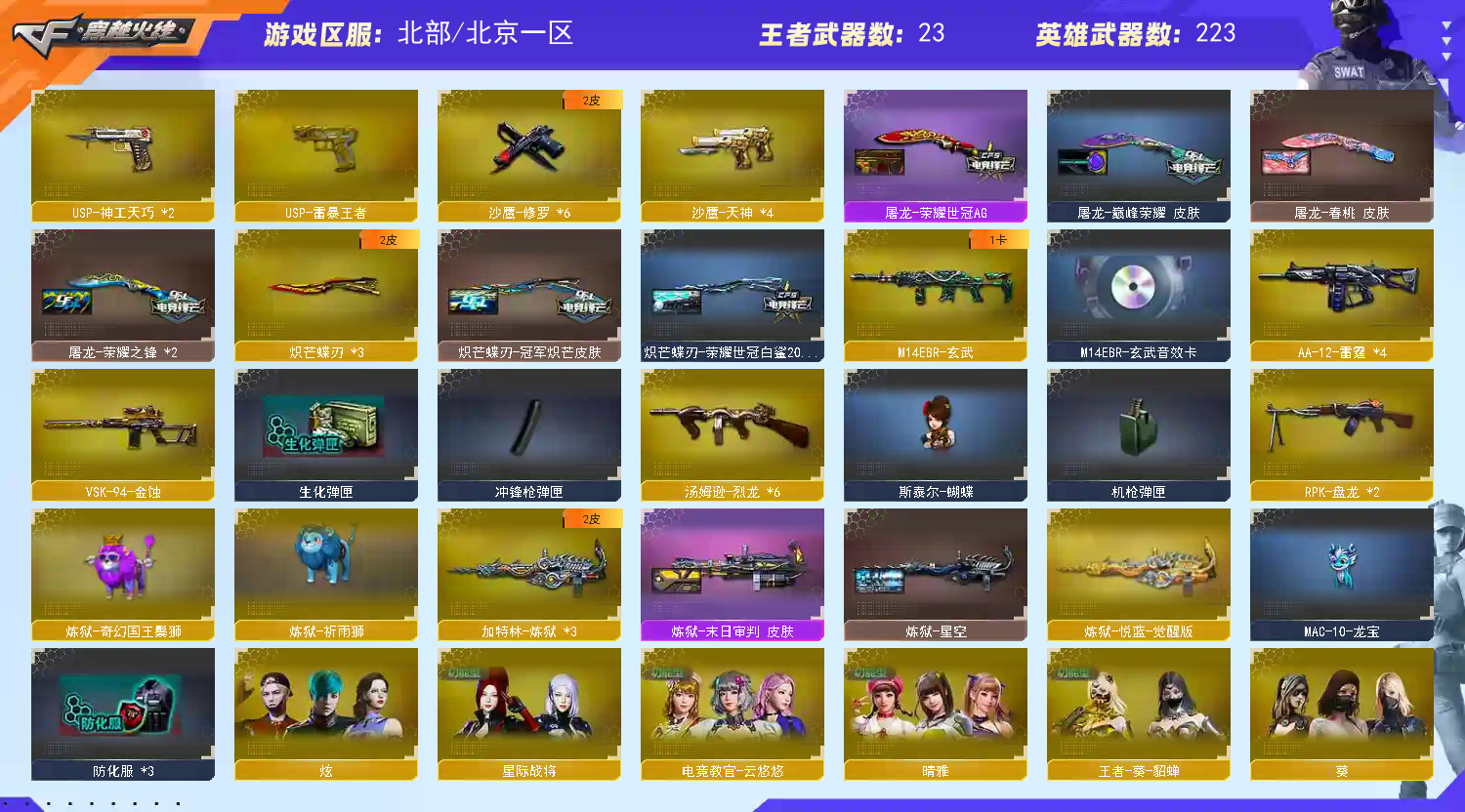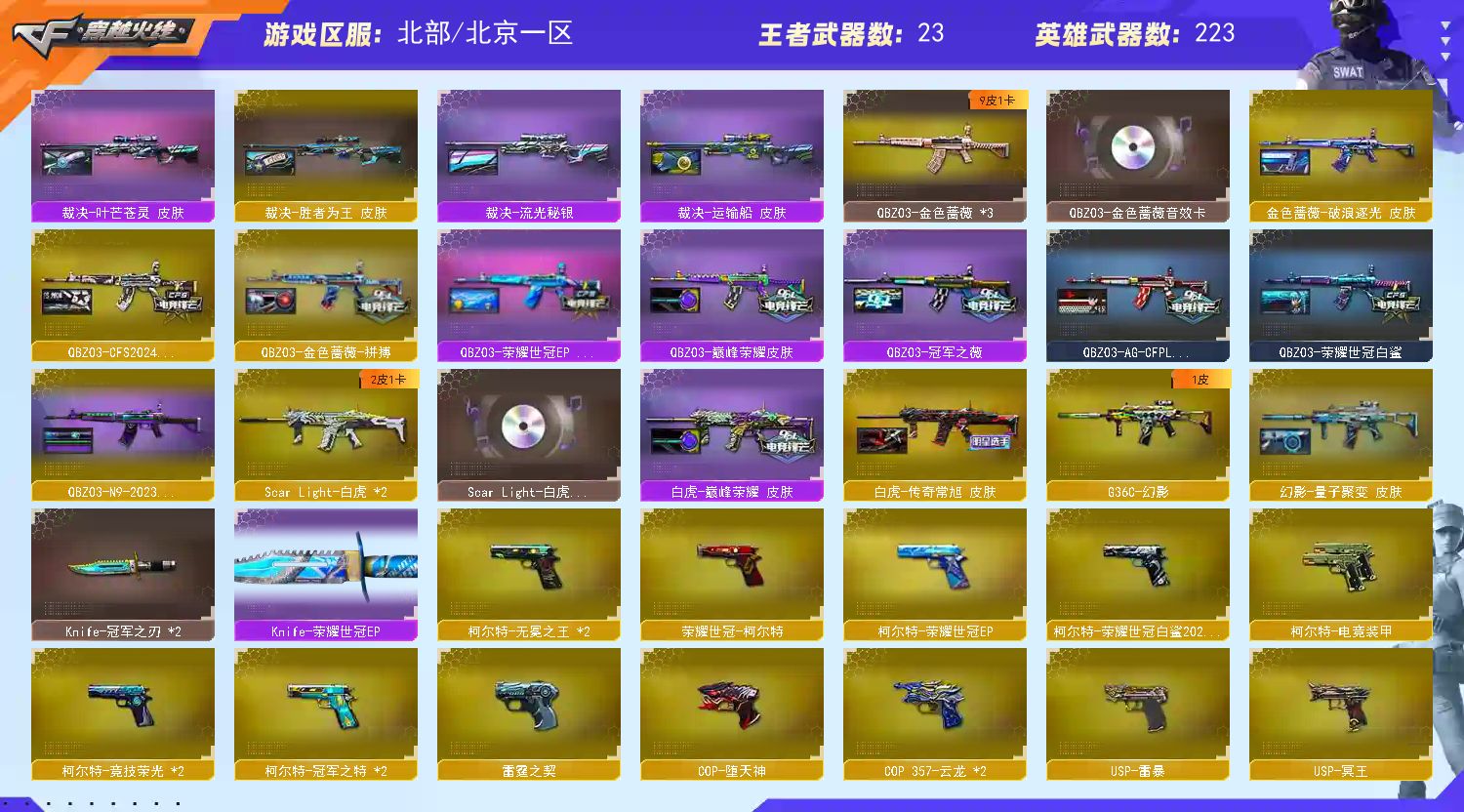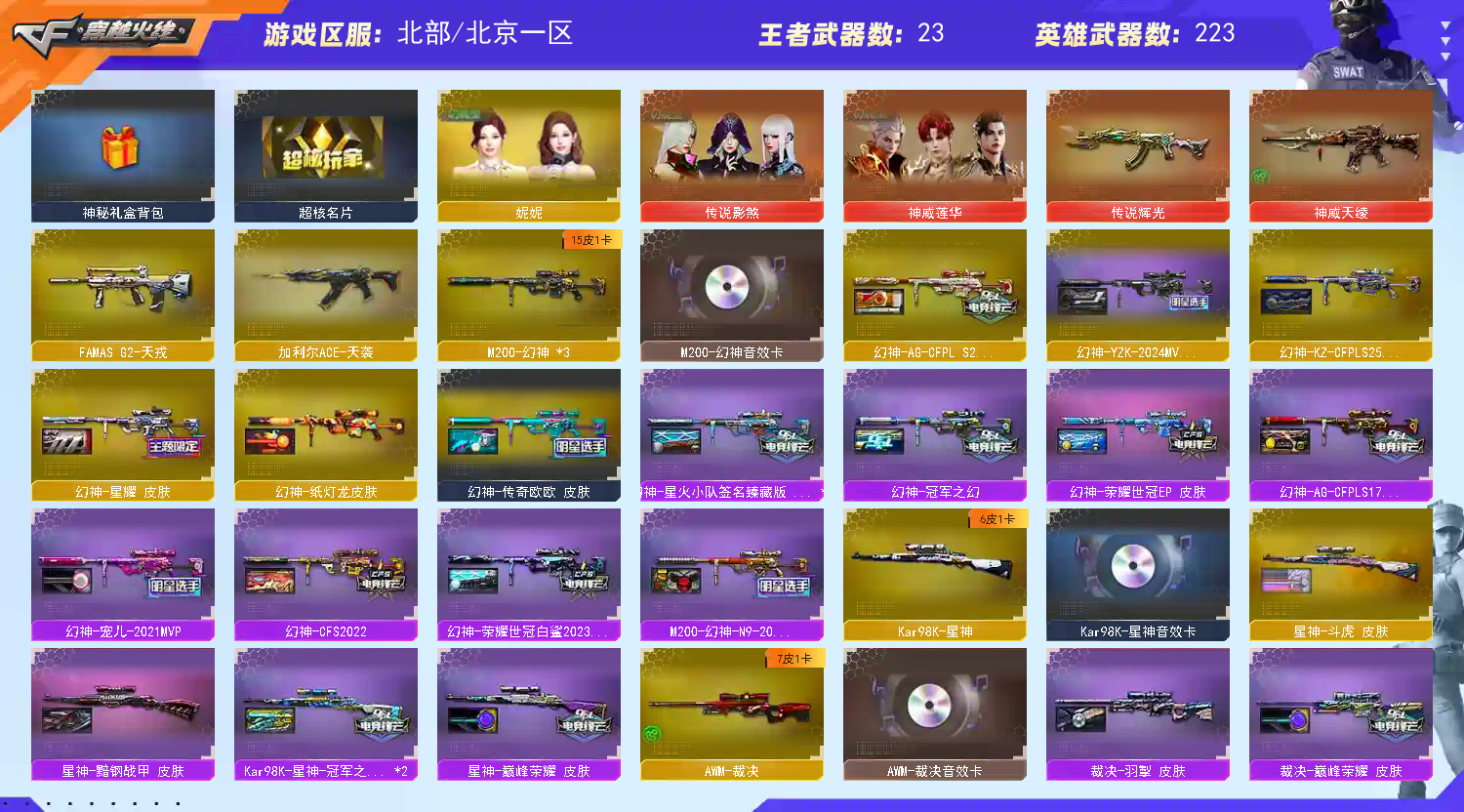 【北京一区/223V/vip1/4传说】【传说影煞/传说辉光】【鹰】【竞技荣光套/6烈龙/6修罗】【M200-幻神*2/M200-幻神音效卡/幻神-星火小队签名臻藏版 皮肤*2/幻神-宠儿-2021MVP/M200-幻神-N9-2022MVP/幻神-冠军之幻/幻神-CFS2022/幻神-AG-CFPLS17冠军/幻神-纸灯龙皮肤/幻神-星耀 皮肤/幻神-荣耀世冠白鲨2023 皮肤】【M200-竞技荣光】【Kar98K-星神/Kar98K-星神音效卡/Kar98K-星神-冠军之星皮肤*2/星神-巅峰荣耀 皮肤】【炽芒蝶刃*3/炽芒蝶刃-荣耀世冠白鲨2023 皮肤】【Knife-冠军之刃*2】【G36C-幻影/VSK-94-金蚀/QBZ03-云龙】【柯尔特-冠军之特*2/柯尔特-无冕之王*2/荣耀世冠-柯尔特/柯尔特-竞技荣光*2/USP-雷暴/USP-雷暴王者/USP-神工天巧*2/柯尔特-荣耀世冠白鲨2023】【Scar Light-白虎*2/Scar Light-白虎音效卡/白虎-巅峰荣耀 皮肤】【QBZ-03-王者蔷薇/QBZ03-金色蔷薇*3/QBZ03-金色蔷薇音效卡/QBZ03-CFS2024 皮肤/QBZ03-冠军之薇/QBZ03-荣耀世冠白鲨/QBZ03-巅峰荣耀皮肤/QBZ03-AG-CFPLS19冠军/金色蔷薇-破浪逐光 皮肤】【QBZ03-天罚/QBZ03-天罚音效卡】【雷神-荣耀世冠AG/M4A1-雷神*5/M4A1-雷神音效卡/荣耀之魄-CFPL十周年臻藏版/雷神-虎牙平台皮肤/雷神-荣耀之魄*2/雷神-宠儿-2019MVP/M4A1-雷神-白鲨皮肤/雷神-冠军之魄/雷神-传奇N9/雷神-R.LGD-CFPLS18冠军/M4A1-雷神-CFS 2019/M4A1-战神赵云/雷神-宇航兔皮肤/雷神-耀金皮肤/雷神-星空/雷神-暗月/雷神-能量核心/雷神-虎将】【柯尔特-电竞装甲/COP 357-云龙*2/雷霆之契/COP-堕天神】【Barrett-毁灭*6/Barrett-毁灭音效卡*2/巴雷特-毁灭-CFPL冠军/毁灭-荣耀之怒/毁灭-冠军之怒/毁灭-SV-CFPLS16冠军/毁灭-BEAN-2020MVP/毁灭-CFS2020/毁灭-星空/毁灭耀金皮肤*2】【AK47-火麒麟*3/AK47-火麒麟音效卡/火麒麟-冠军之心/AK47-火麒麟-传奇EVEN/火麒麟-CFSTAR*3/火麒麟-大唐荣光/火麒麟-盘古/火麒麟-心动糖果/火麒麟-雷神】【M4A1-黑骑士*2/M4A1-黑骑士音效卡/黑骑士-冠军之势/黑骑士-CFS2021/黑骑士-海王/黑骑士-AG-S4冠军典藏/黑骑士耀金皮肤】【M4A1-黑龙/M4A1-黑龙-361/黑龙-能量核心】【HK417-朱雀】【AK47-无影/无影-神兵利器/无影-能量核心】【AK47-黑武士/黑武士-锦绣游龙】【AWM-天龙/天龙-CFSTAR/AWM-天龙-传奇70KG/AWM-天龙-传奇白鲨/天龙-能量核心】【Barrett-极光*2/极光-能量核心】【AWM-裁决/AWM-裁决音效卡】【M4A1-死神/M4A1-千变/M4A1-千变-孔明皮肤】【汤姆逊-烈龙*6/烈龙-云海游龙】【RPK-盘龙*2】【加特林-炼狱*3/炼狱-悦蓝/炼狱-星空】【斯泰尔-蝴蝶/死亡之眼】【沙鹰-修罗*6/修罗-CFSTAR/修罗-冠军之魂/修罗耀金皮肤/修罗-能量核心】【沙鹰-天神*4/天神-动感闪耀】【云龙扇】【麒麟刺*4】【擎天*4/擎天-冠军之击/擎天-云海游龙/擎天-竞技荣光】【屠龙*2/屠龙-荣耀世冠AG/屠龙-荣耀之锋*2/屠龙-动感闪耀/屠龙-秘银/屠龙-春桃 皮肤】【荣耀世冠-龙啸/龙啸/龙啸-烈火龙威】【电竞教官-云悠悠/职业选手/机械姬/炫/晴雅/王者-魅影/王者零-华冠丽服/王者-零/王者-葵-貂蝉/兰-海滩派对/堕落女神/星际战将/奇洋探员/云海玲珑/乔伊教练/兰-新年限定/妲己/斯沃特-X/救世主-X/影武者-X/新娜塔莎/幻影/堕天使/复仇者】【M4A1-神工天巧/M14EBR-玄武/M4A1-玫瑰精灵*2/M4A1-猎神/M4A1-雷霆/M4A1-武圣*3】【AK47-B-常胜将军/AK47-B-身先士卒/AK47-B-战士/AK47-B-战神/AK-47-猩红传说*26】【AA-12-雷霆*4/AK47-黑鲨/AK12-天启】【超新星-悦享*2/超新星-热带奇洋】【Barrett-暗月传说*2】【Colt1911-小故障*2/Colt 1911-大黄蜂*3/柯尔特-萌杀*2/COP 357-青龙/新USP-枪王排位奖励*3】【龙啸-热带奇洋/金刚伞/金刚伞-电玩红兔/唐刀-神工天巧】【神圣爆裂者III*2/机甲撕裂者III/激光毁灭者III】【斯泰尔-巧克力/轻型军用手斧-镜*2】【牛牛-AK47/MAC-10-龙宝/COP-白鲨/火麒麟-灵狐/MK5-炽火炎龙/金色小号】【王者之魄*4/王者之势/王者之光/王者之击/王者之啸/王者星霆/王者之武】【高爆手雷-竞技荣光/闪光弹-竞技荣光/烟雾弹-竞技荣光】【高爆手雷-云龙/闪光弹-云龙/烟雾弹-云龙/手雷-云海游龙】【高爆手雷-雷暴*5/闪光弹-雷暴*5/烟雾弹-雷暴*4】【闪光弹-雷霆*6/烟雾弹-雷霆*6】【高爆手雷-雷霆王者*2/闪光弹-雷霆王者】【高爆手雷-神工天巧/烟雾弹-神工天巧*2】【闪光弹-幻灵】【闪光弹-电竞装甲/烟雾弹-电竞装甲】【高爆手雷-雷暴王者】【烟雾弹-荣耀世冠白鲨2023】【手雷-热带奇洋】【炫金无影/炫金黑龙/炫金天龙*3/炫金修罗】【语音特效-云海游龙】【超级护目镜/透明头盔/烟雾保护头盔/闪光护目镜/超级对讲机/超级背包/炫彩背包/防弹头盔*3/防弹衣*3/C4工具钳*2/手雷包*2/防化服*3】;USP-雷暴,柯尔特-无冕之王,USP-雷暴王者,荣耀世冠-柯尔特,柯尔特-荣耀世冠白鲨2023,柯尔特-冠军之特,炽芒蝶刃,