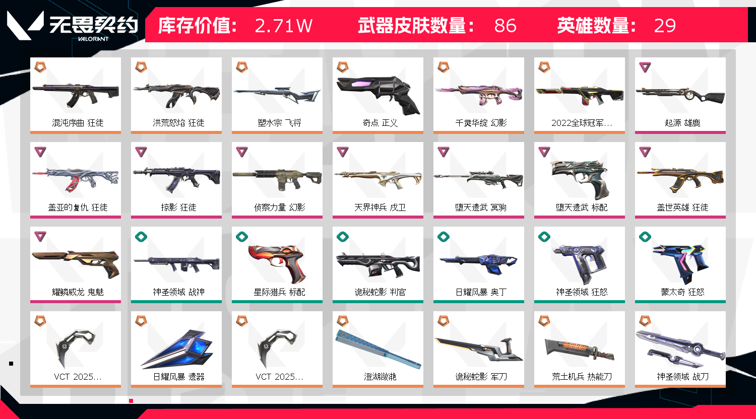 可排位♥VCT25爪刀♥22幻影♥盖亚的复仇ak♥流脓ak♥混沌序曲ak♥千灵华绽幻影♥弃王标配