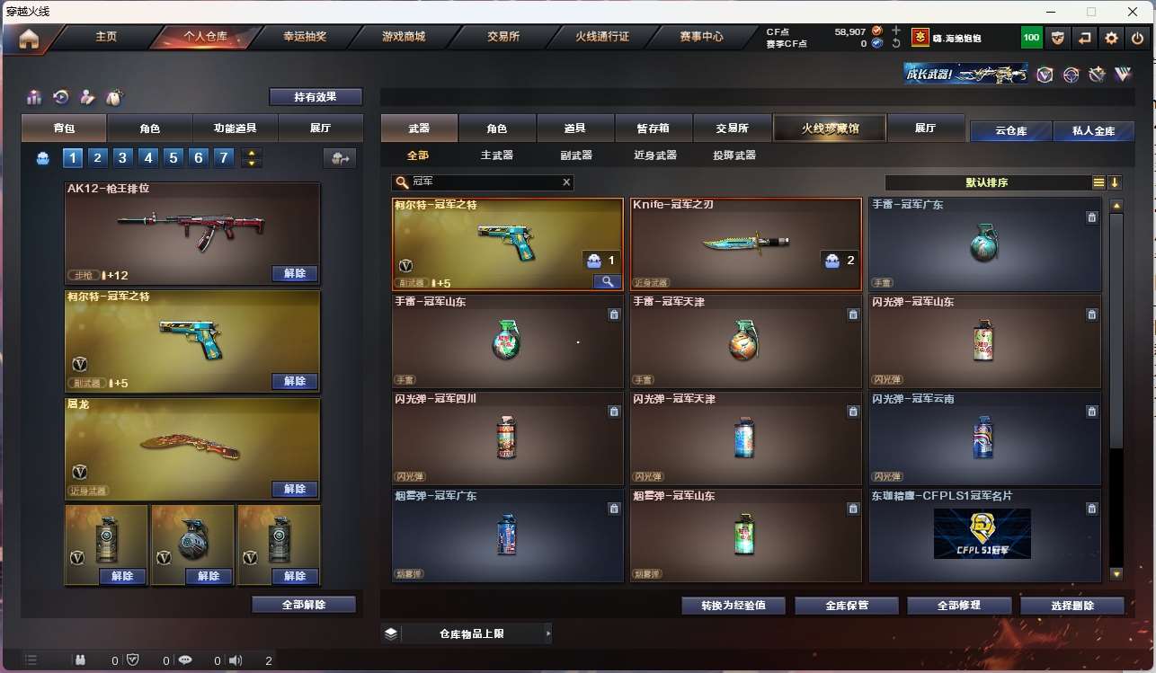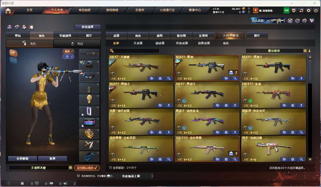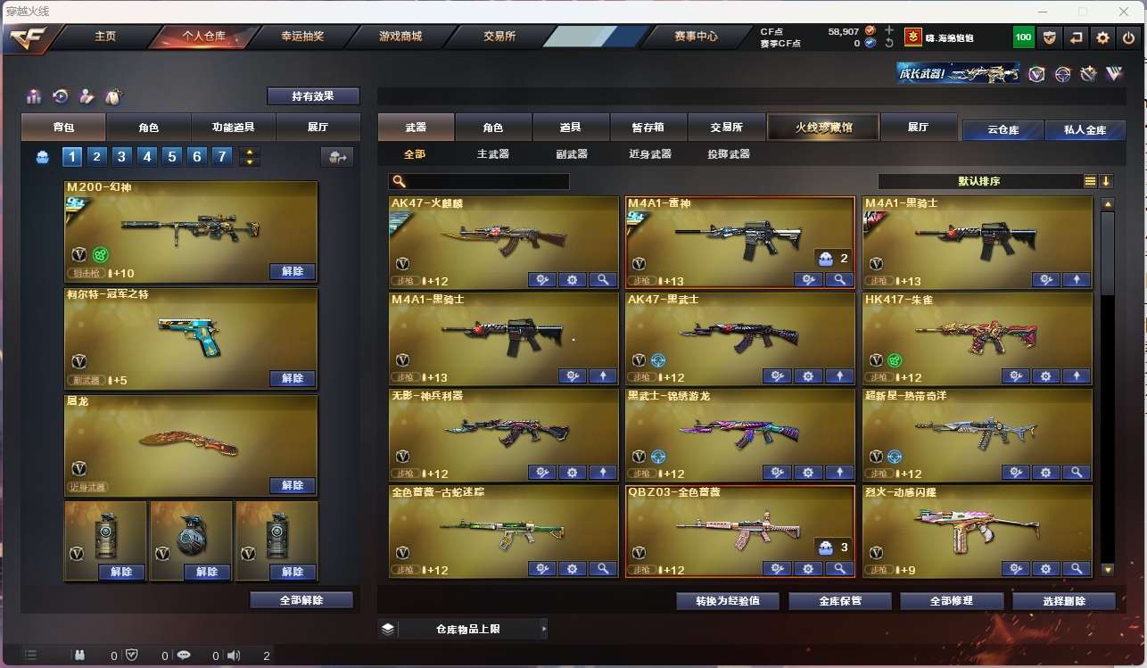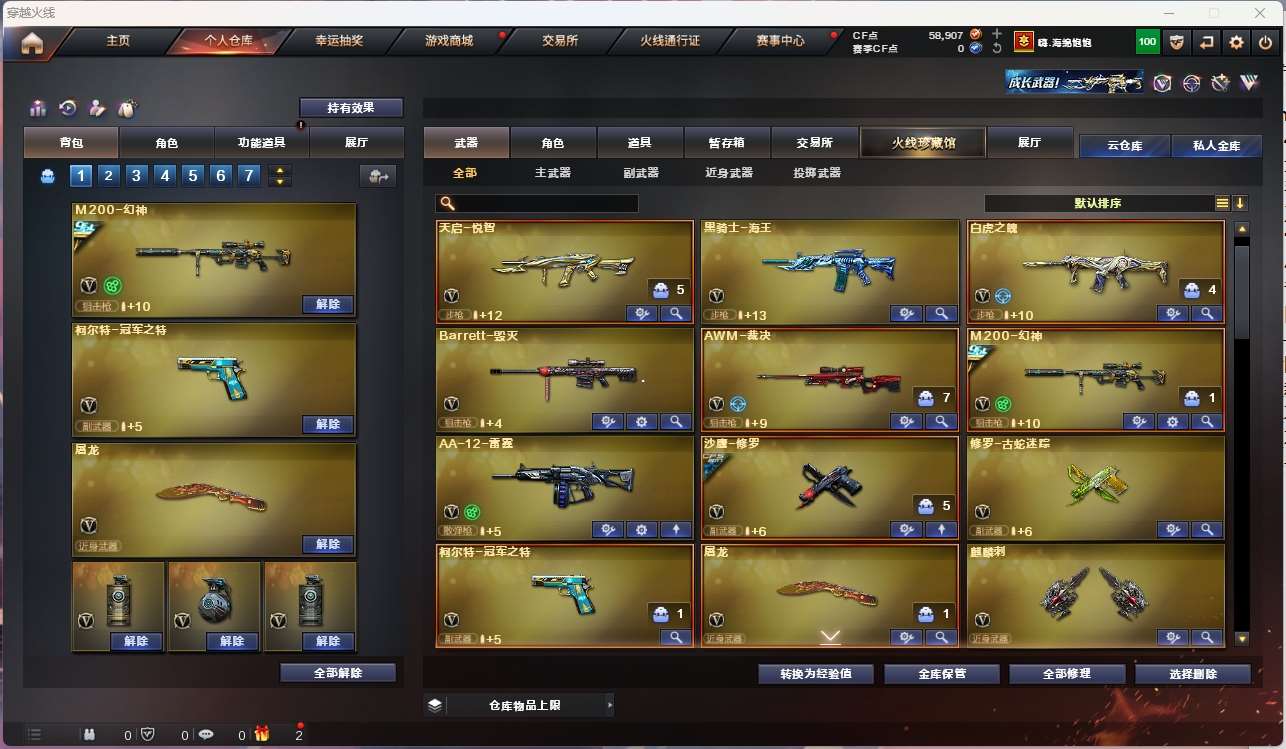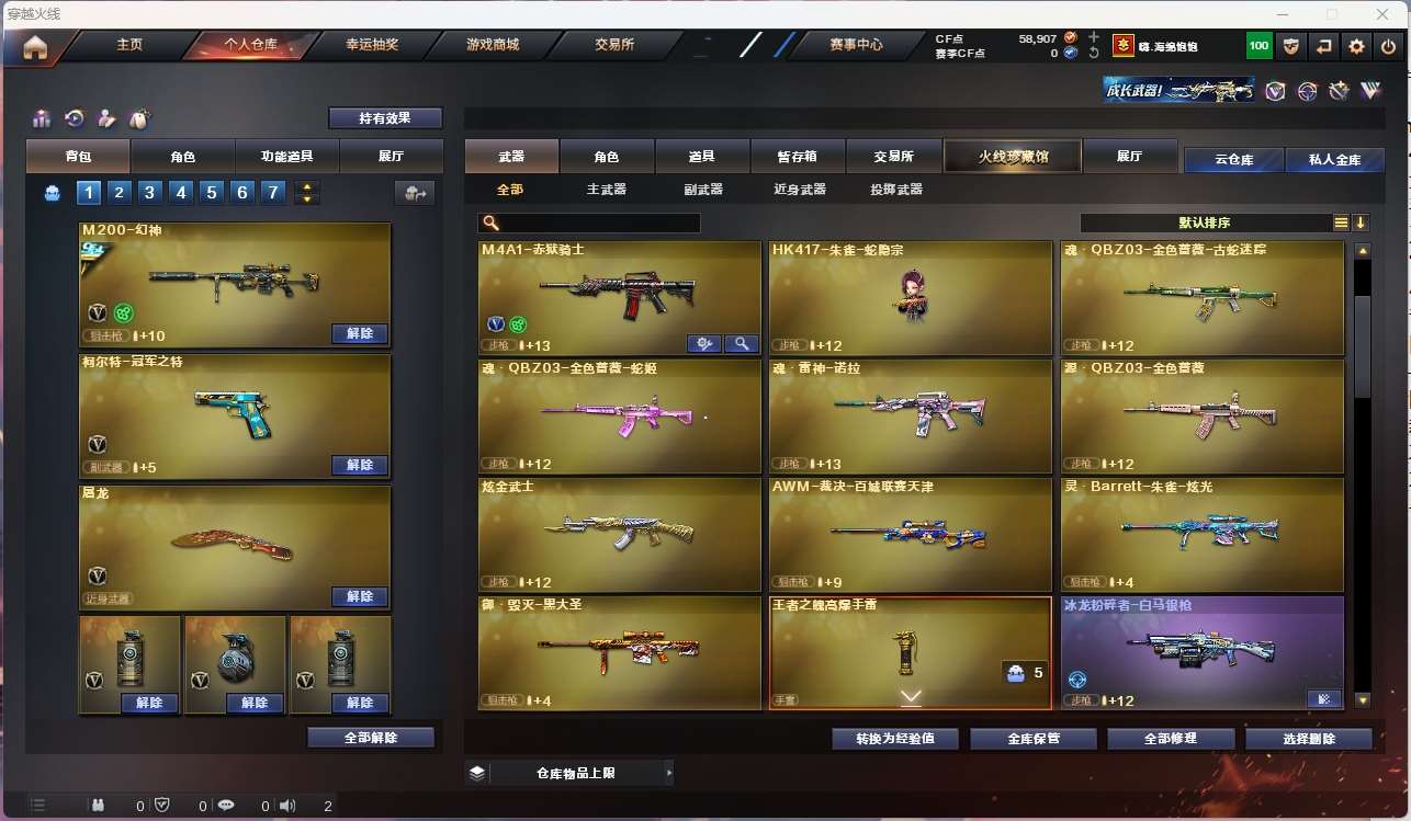 【m200幻神+音效卡+冠军之幻+冠军之特+冠军之刃】【白虎之魄】【qbz金色蔷薇】【hk417朱雀+卡】【火麒麟+横秒之巅】【雷神+冠军之魄+s18冠军+航星】【黑骑士+卡】【毁灭】【裁决】 【武器:海王 】 【3手呛:修罗 冠军之特】 【6刀具:屠龙 麒麟刺 尼泊尔雷霆 】 【3雷套:雷霆雷 竞技荣光雷*2】 【小人呛:】 【音效卡: 朱雀音效卡 黑骑士音效卡 幻神音效卡 】 【四防角色:王者炽天使】;柯尔特-冠军之特,Knife-冠军之刃,QBZ03-金色蔷薇,M200-幻神,Scar Light-白虎,