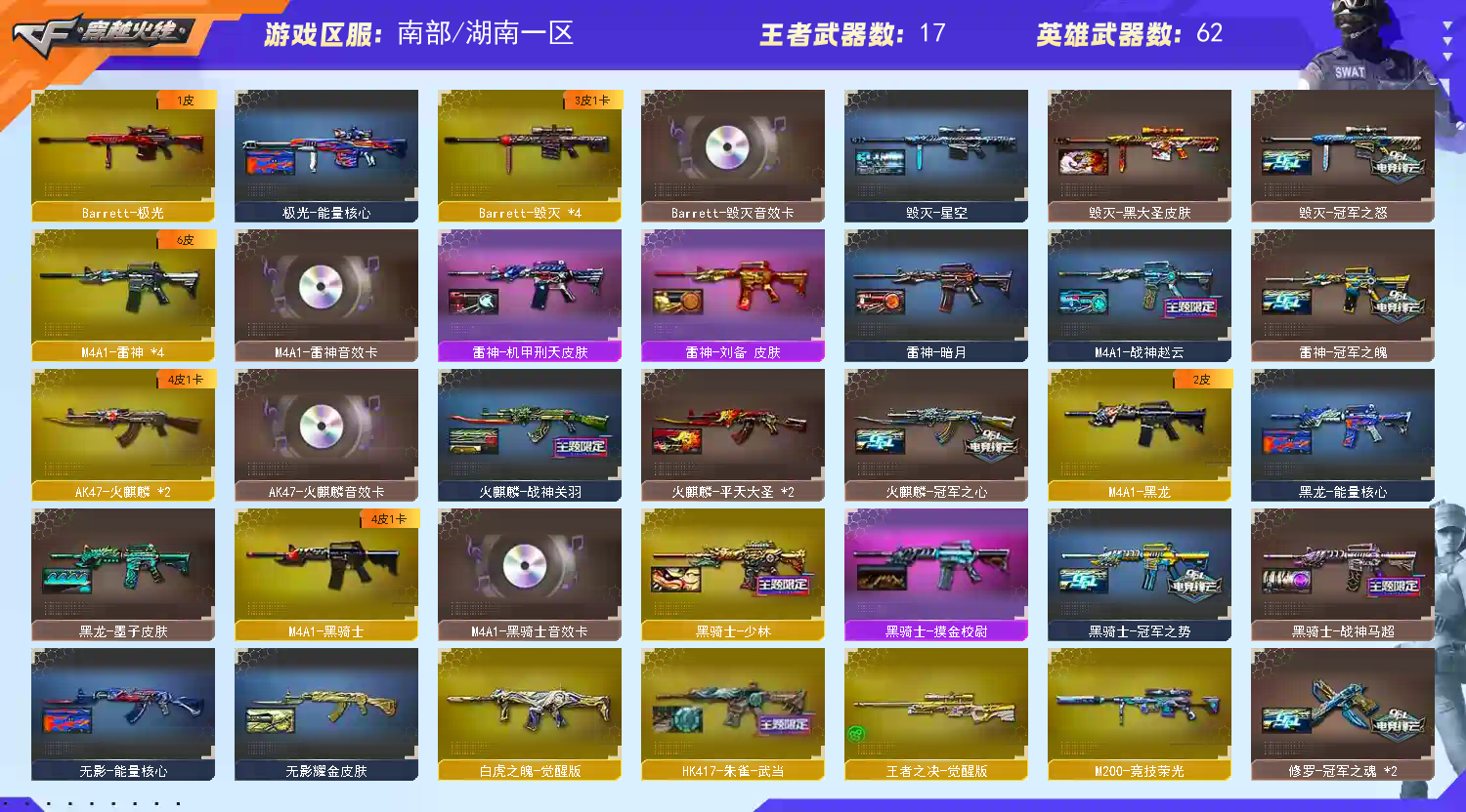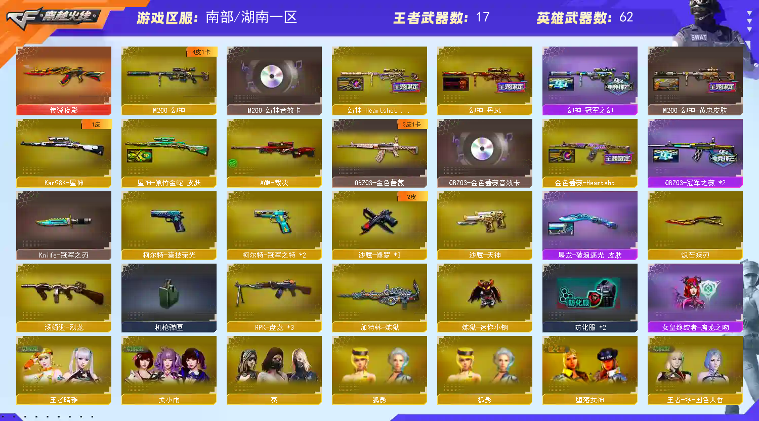 【亮点解析 幻神4皮带卡 冠军套】【m200幻神+幻神音效卡+黄忠+冠军之幻+女团+丹凤+冠军之特*2+冠军之刃】【98k星神+傲竹金蛇】【m200竞技荣光】【传说夜影】【白虎之魄】【qbz金色蔷薇+卡+女团+冠军之薇】【朱雀+武当】【火麒麟+卡+冠军之心 】【黑龙】【雷神+卡+冠军之魄】【黑骑士+卡+少林+冠军之势 】【毁灭+卡+冠军之怒+冠军之怒+枪娘】【极光】【裁决 】【炽芒蝶刃】【武器:王者青龙 王者之烈 王者霜心 盘龙*3 炼狱 烈龙】【7手枪:修罗*3 天神 竞技荣光 冠军之特】【9刀具:屠龙*3 擎天*3 麒麟刺 幻灵之峰 王者云击】【雷套:幻灵雷*3】【小人枪:雷神枪娘雷安娜 炼狱小刚 】【音效卡:雷神音效卡 金色蔷薇音效卡 幻神音效卡 黑骑士音效卡 火麒麟音效卡 毁灭音效卡 】【四防角色:关小雨 王者零国色天香 王者晴雅 】;柯尔特-冠军之特,炽芒蝶刃,Knife-冠军之刃,RPK-盘龙,QBZ03-金色蔷薇,M200-幻神,Kar98K-星神,