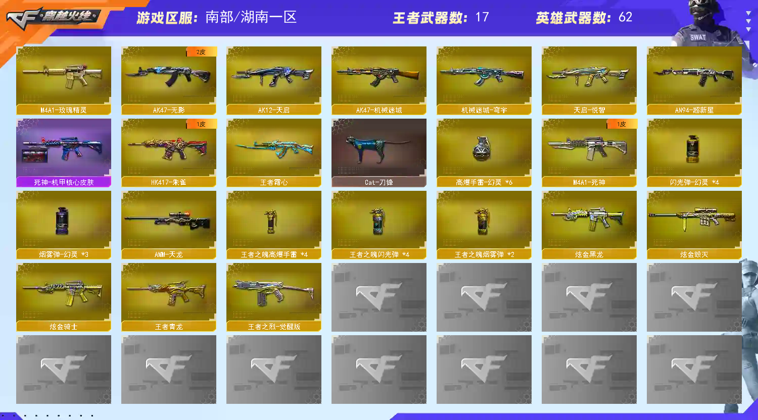 首页 > 租号大厅 > 穿越火线 > 电信区/湖南一区 > 南部❤幻神+卡+黄忠+冠幻+女团+丹凤+冠特*2+冠刃+炽芒蝶刃❤98K星神传说夜影金色蔷薇