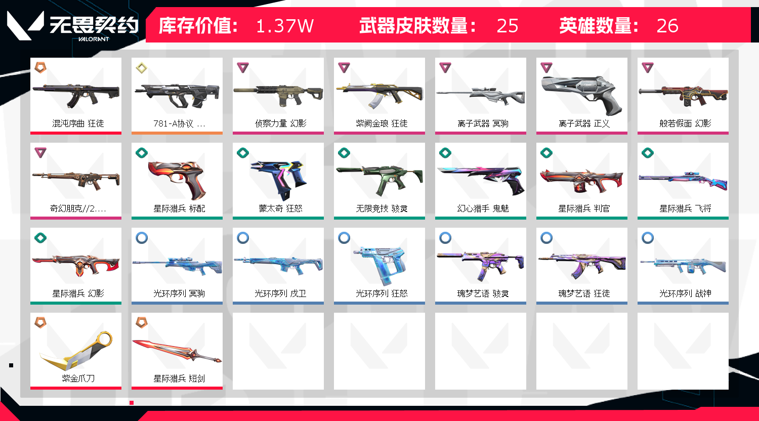 首页 > 租号大厅 > 无畏契约-wegame > wegame/wegame > 可排位 紫金爪刀/奇幻朋克戍卫/离子正义,冥驹/侦查幻影,般若幻影/781撩犬/混沌序曲狂徒紫金狂