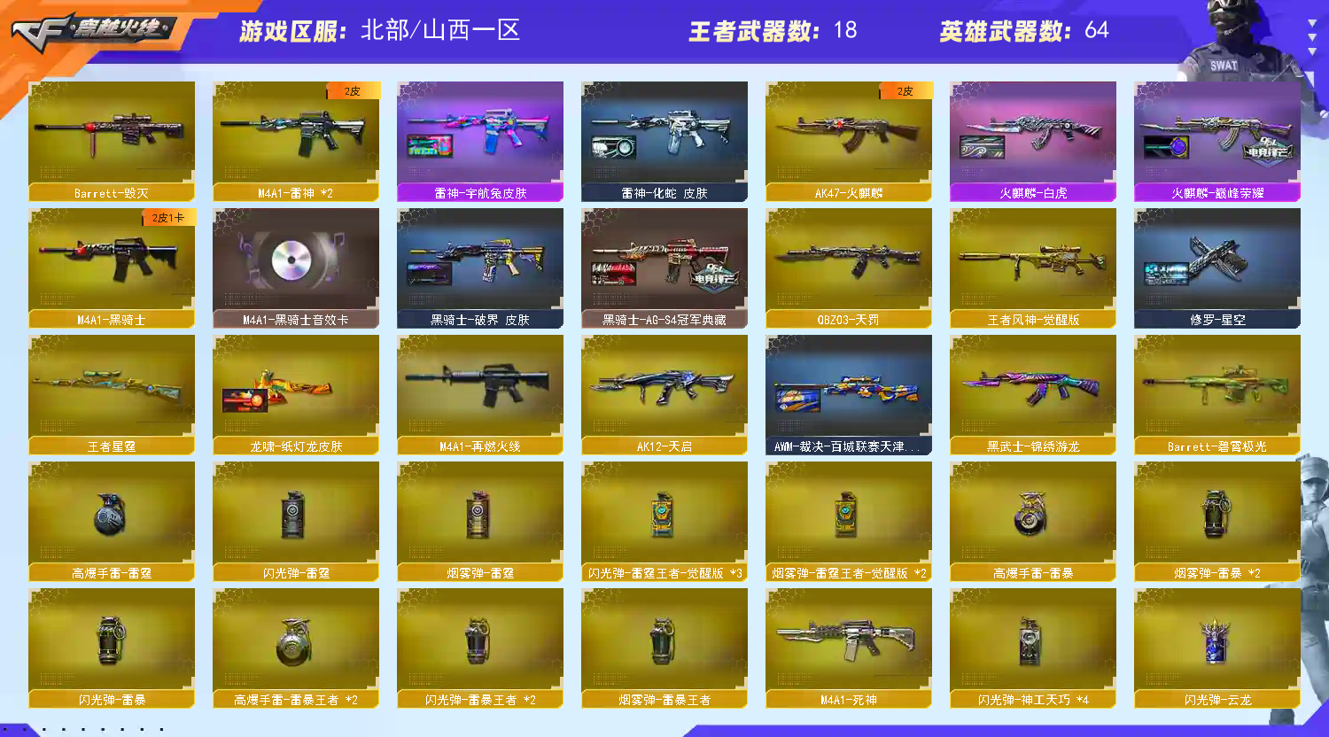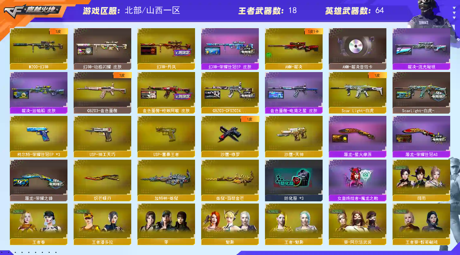 狙:王者风神 M200幻神(荣耀世冠ep皮肤 丹凤皮肤 动感闪耀皮肤)AWM裁决三件套(音效卡流光秘银皮肤)王者星霆(跟星神一样)巴雷特毁灭(SV皮肤) 步枪:白虎(冠军之虎皮肤)QBZ天罚 (带音效卡)QBZ金色蔷薇(cfs2024皮肤 枪娘皮肤 电竞之星皮肤)火麒麟(白虎皮肤 巅峰荣耀皮肤 CFstar皮肤 CF2018皮肤)雷神(宇航兔皮肤 再燃火线皮肤 化蛇皮肤 源计划2.0皮肤)黑骑士三件套(音效卡AGs4皮肤破界皮肤)玄武 死神 天启 朱雀 机枪:加特林(夏佐皮肤) 冲锋枪:烈龙1 副武器:柯尔特荣耀世冠ep3 usp神工天巧1 usp王者雷暴1 天神2 修罗1 近战武器:屠龙2(荣耀世冠ag皮肤荣耀皮肤星火燎原皮肤蓝粉光效竞星跃动光效)擎天2(蒸汽钟表皮肤)炽芒蝶刃1 麒麟刺1 擎天竞技荣光1 玄豹丛林匕首1 擎天云海游龙1 麒麟刺百战金芒1 龙啸2(纸灯笼皮肤再燃火线皮肤)雷霆王者之锋1 尼泊尔雷霆1 屠龙电竞之星1 手雷:王者雷暴三套 雷暴一套 雷霆一套 玄豹一套 王者雷霆三套 竞技荣光一套 云海游龙一套 神工天巧闪光弹4 角色:四防王者春 四防王者魅影 四防王者葵惊若翩鸿 四防王者潘多拉 思雨 魅影 戒指击杀图标都有;USP-雷暴王者,炽芒蝶刃,QBZ03-金色蔷薇,M200-幻神,Scar Light-白虎,