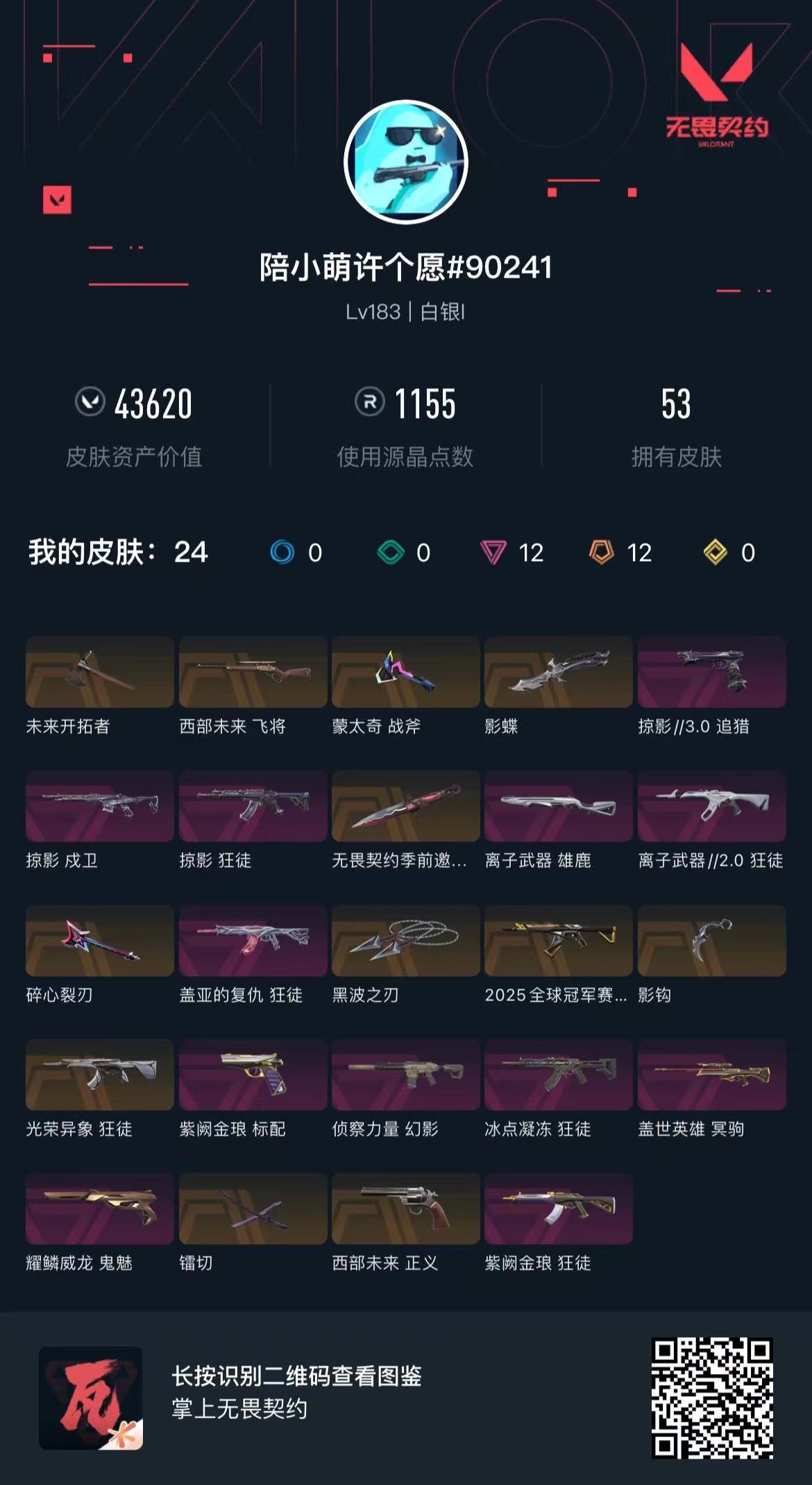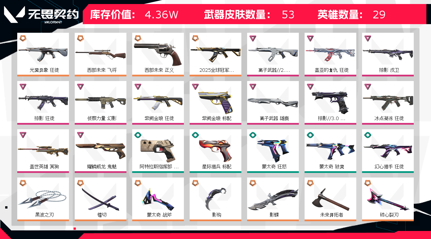 可排位 英雄28 武器皮肤数量53;黑波之刃,镭切,盖亚的复仇 狂徒,掠影 戍卫,掠影 狂徒,侦察力量 幻影,紫阙金琅 狂徒,