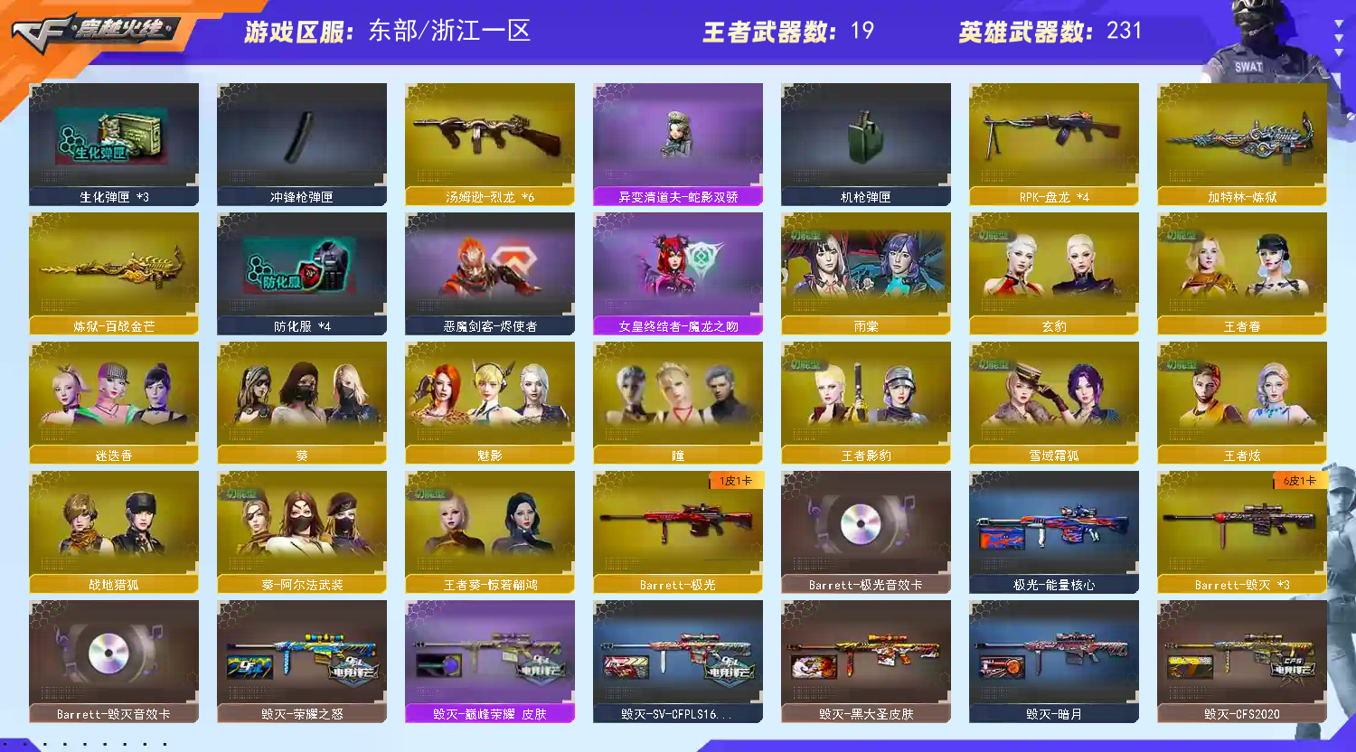 【商品标题】:东部浙江一区-243V-可二次实名-【Lv.102-荣耀元帅】-【段位:荣耀枪王】 【稀有武器】:M200-幻神/Kar98K-星神/G36C-幻影/ScarLight-白虎/AK47-雷暴/雷霆之契/USP-雷暴/COP-堕天神(3)/破空枪刃-夜魔/柯尔特-竞技荣光/USP-神工天巧/天神-动感闪耀/COP357-云龙/柯尔特-荣耀世冠白鲨2023/修罗-古蛇迷踪/沙鹰-幻兽/柯尔特-冠军之特(2)/金色蔷薇-古蛇迷踪/QBZ03-金色蔷薇/AK47-火麒麟(2)/M4A1-黑龙/M4A1-雷神(5)/M4A1-黑骑士(2)/AK47-无影/荣耀世冠-火麒麟/Barrett-毁灭(3)/Barrett-极光/AWM-裁决/M200-竞技荣光/RPK-盘龙(4)/加特林-炼狱/汤姆逊-烈龙(6)/AA-12-雷霆/炽芒蝶刃(2)/斩神刀-雷暴/马来剑-夜魔/擎天-竞技荣光/云龙扇/女皇利刃-幻兽 【王者武器】:王者之心-觉醒版/王者之魄-觉醒版/白虎之魄-觉醒版/王者之光-觉醒版/王者之决-觉醒版/王者幻神-觉醒版 【热门角色】:迷迭香/雨棠/魅影/奇洋探员/乔伊教练/蛇隐宗/王者春/王者影豹/王者炫/潘多拉-X/幽/潘多拉 【热门音效卡】:M200-幻神音效卡/Kar98K-星神音效卡/AWM-裁决音效卡/Scar Light-白虎音效卡/Barrett-毁灭音效卡/M4A1-黑骑士音效卡/Barrett-极光音效卡 【热门皮肤】:幻神-星耀皮肤/幻神-宠儿-2021MVP/幻神-星火小队签名臻藏版皮肤/幻神-AG-CFPLS17冠军/幻神-冠军之幻/白虎-白鲨-CFPLS23冠军/裁决-巅峰荣耀皮肤/屠龙-星火燎原/QBZ03-冠军之薇/白虎-巅峰荣耀 皮肤/屠龙-破浪逐光皮肤/星神-璀璨皮肤/裁决-流光秘银/白虎-AG-CFPLS20冠军/炽芒蝶刃-破浪逐光皮肤/屠龙-巅峰荣耀皮肤/QBZ03-荣耀世冠白鲨/炽芒蝶刃-荣耀世冠白鲨2023皮肤/黑骑士-AG-S4冠军典藏/屠龙-荣耀之锋/毁灭-荣耀之怒/屠龙-春桃皮肤/毁灭-CFS2020/雷神-荣耀之魄 【其他亮点】:Knife-冠军之刃/白虎-九尾白狐/VEPR-12-金魔/烟雾弹-荣耀世冠白鲨2023/哔哩哔哩名片/哔哩哔哩名片 (截图展示段位不代表实际段位,如赛季更新等不可抗拒因素发生变化,其余道具看截图或咨询客服);USP-雷暴,USP-雷暴王者,柯尔特-荣耀世冠白鲨2023,柯尔特-冠军之特,炽芒蝶刃,Knife-冠军之刃,妮妮,