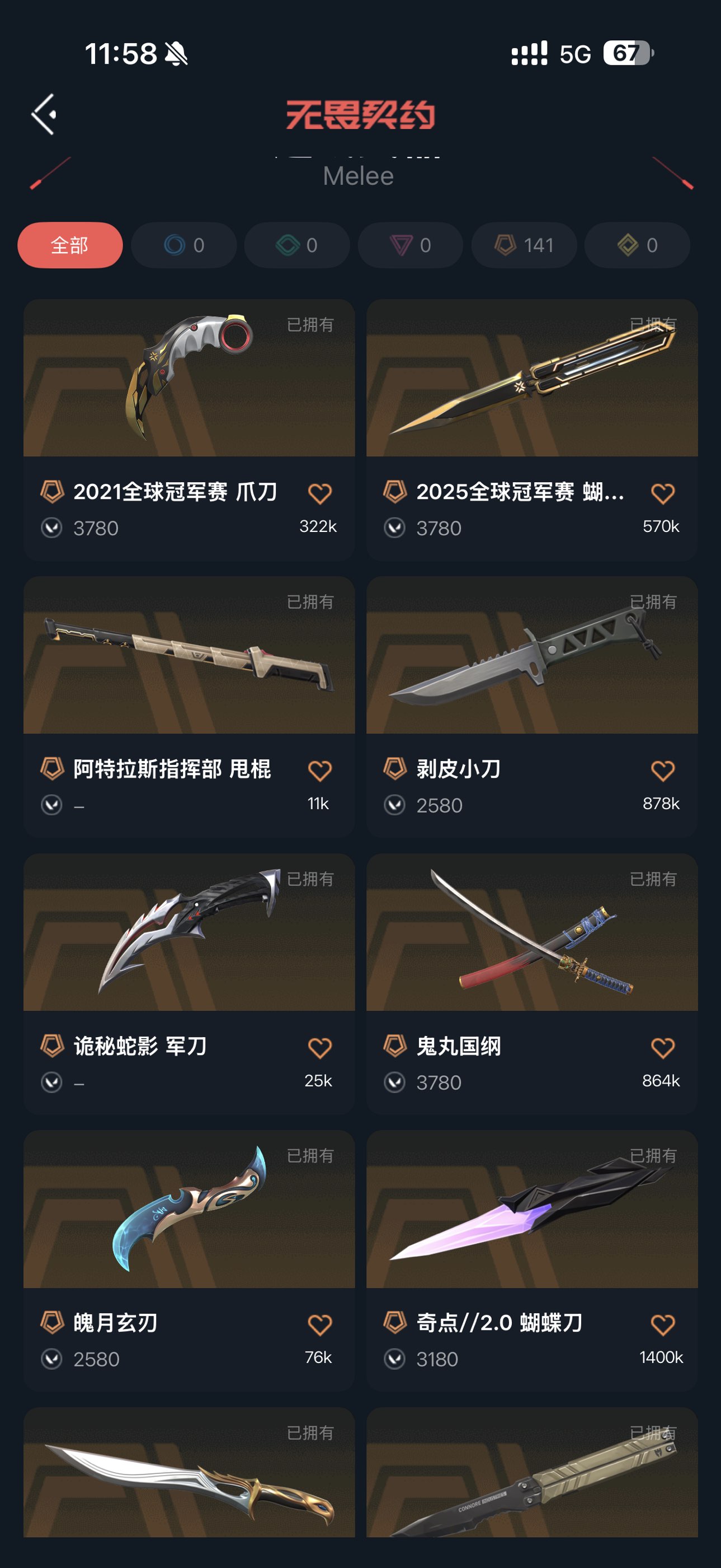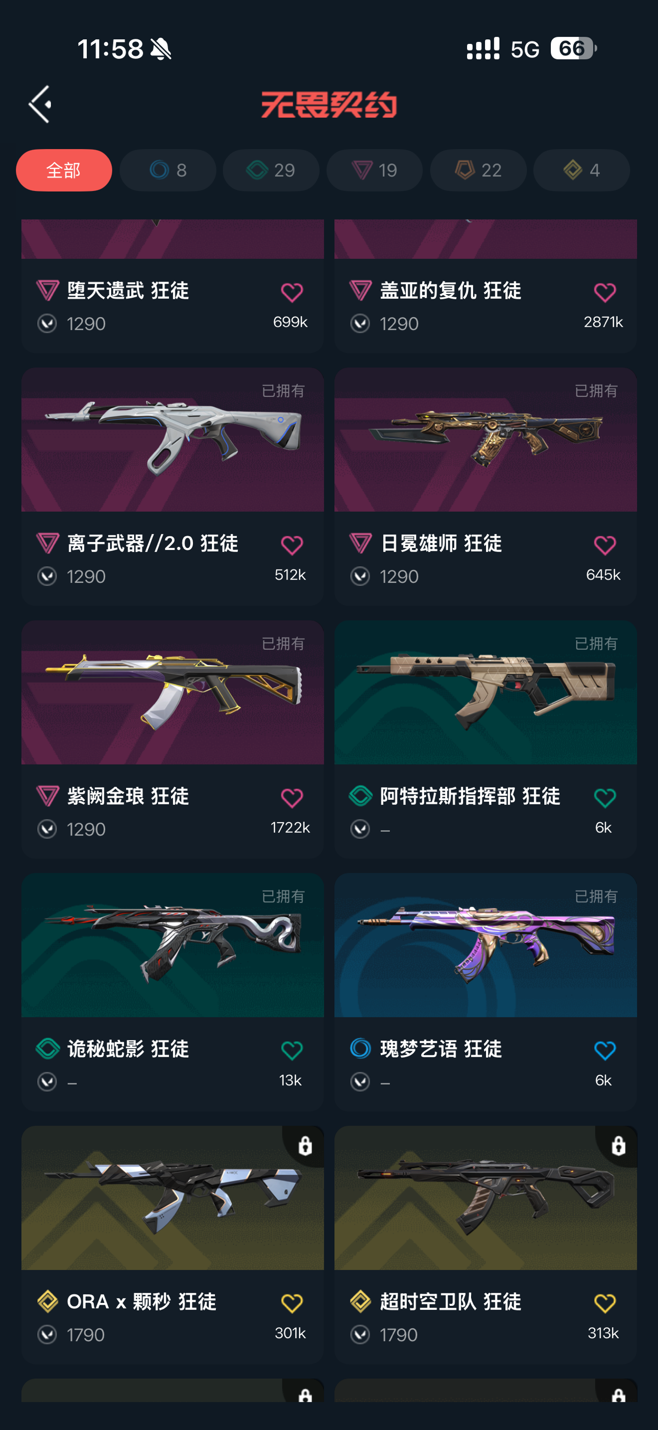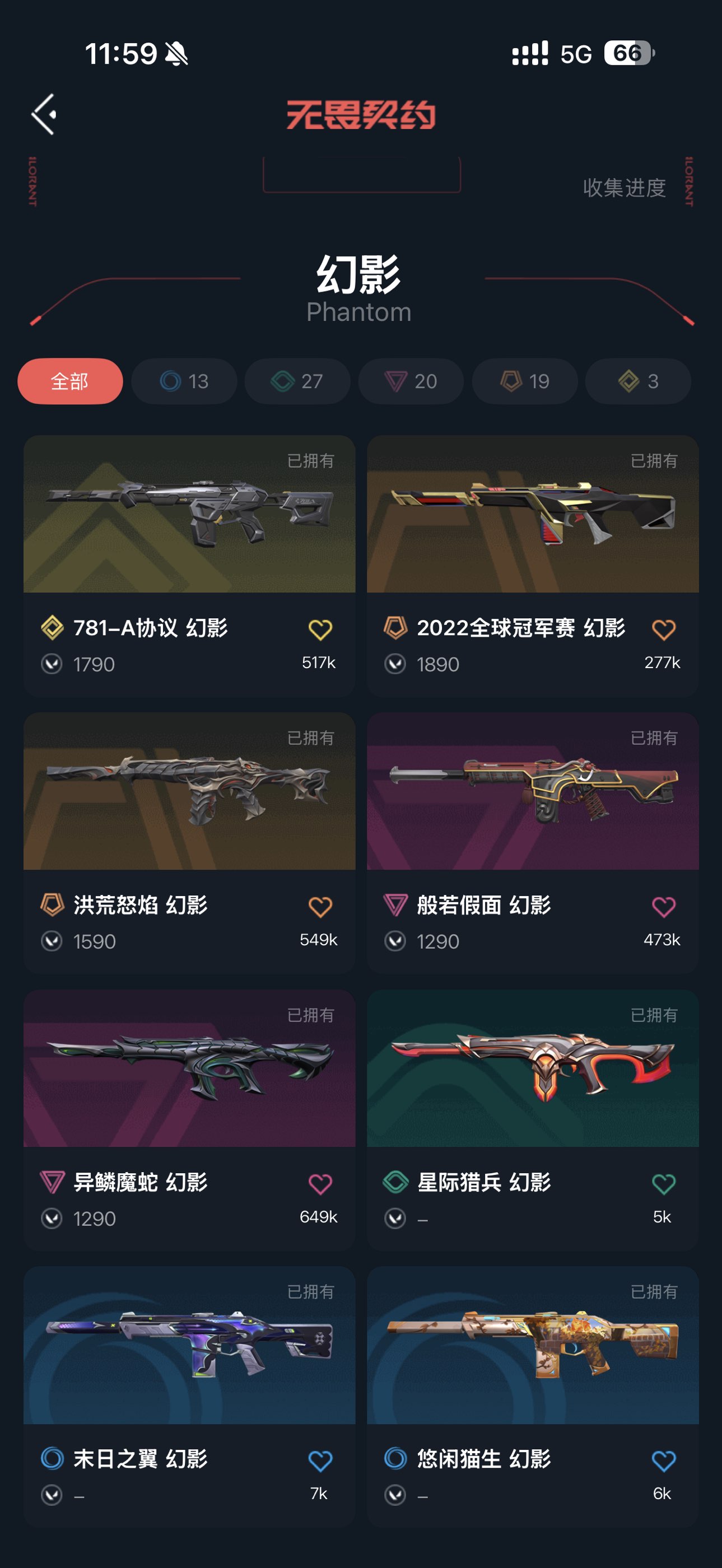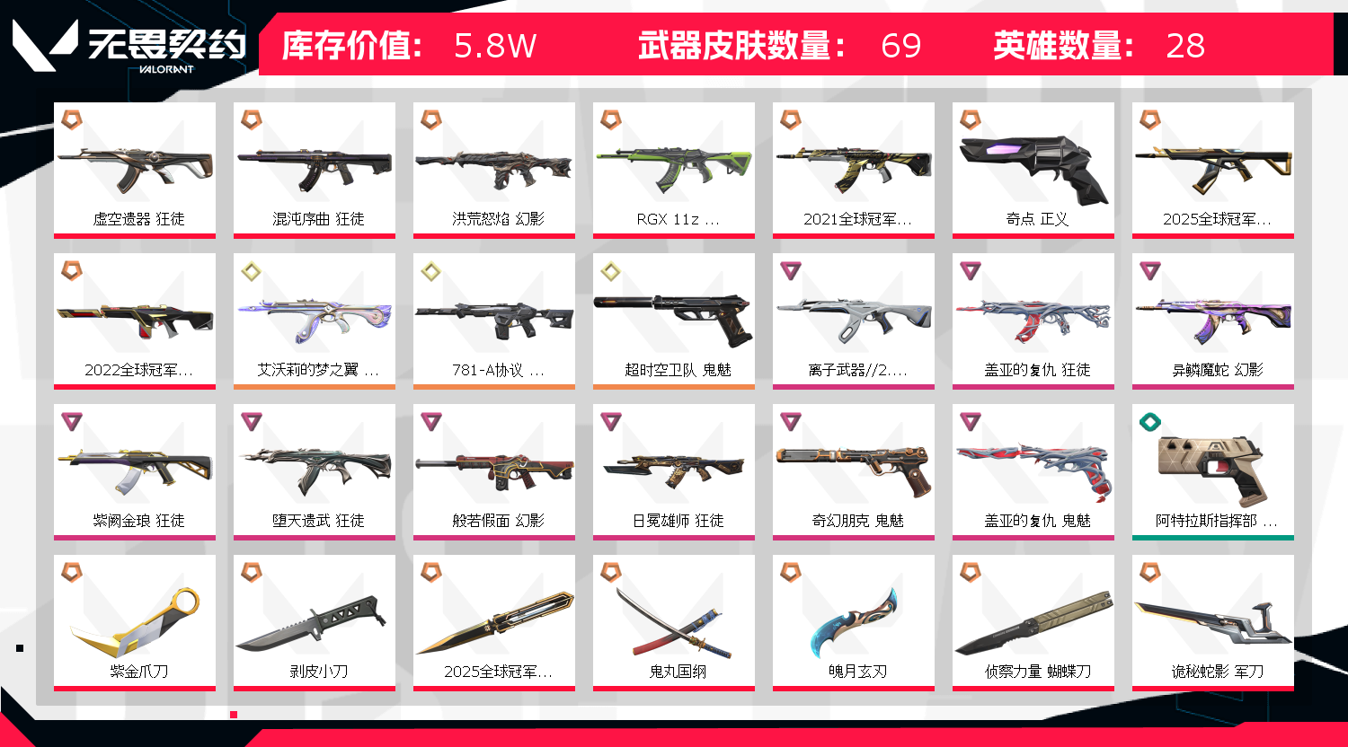 可排位 英雄28 武器皮肤数量69 紫金爪;紫金爪刀,剥皮小刀,盖亚的复仇 狂徒,虚空遗器 狂徒,异鳞魔蛇 幻影,洪荒怒焰 幻影,紫阙金琅 狂徒,