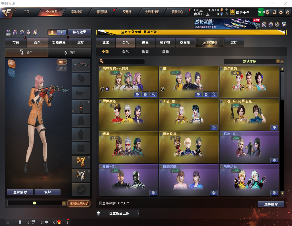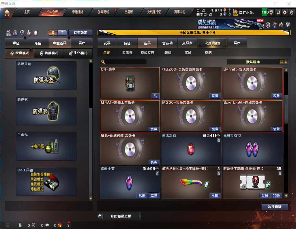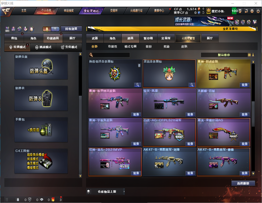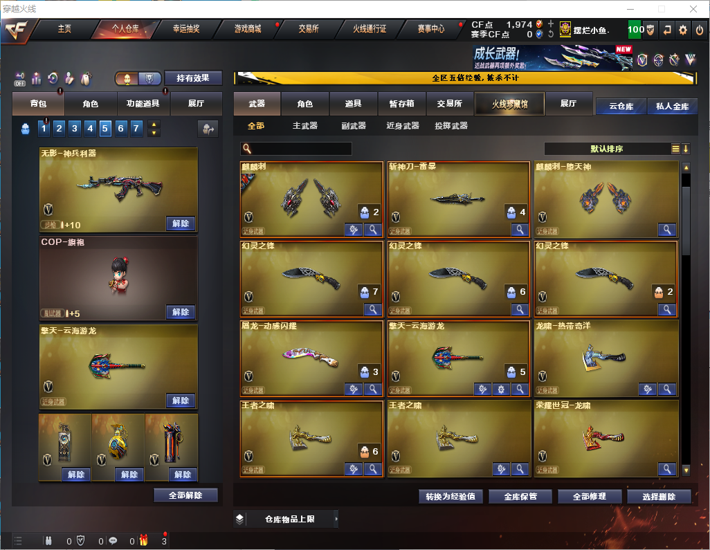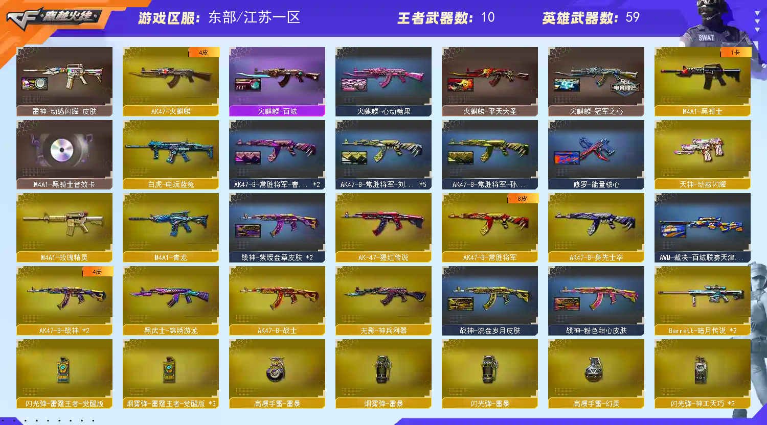 传说辉光/传说圣灵【白虎三件套】【幻神三件套】【黑骑士三件套】 【步枪】传说辉光/火麒麟/雷神/黑骑士/青龙/白虎/玄武/无影/神兵利器/黑武士锦绣游龙/超新星热带奇洋/玫瑰精灵/QBZ金色蔷薇/ 【狙击枪】传说圣灵/毁灭/激光/裁决/幻神/暗月传说/ 【机枪】炼狱风暴/ 【冲锋枪】烈龙云海游龙/ 【散弹枪】AA12雷霆 【挑战强化武器】黑骑士/白虎/黑武士锦绣游龙/超新星热带奇洋/玫瑰精灵/烈火/烈火风暴/白虎电玩蓝图/裁决/烈龙风暴/烈龙云海游龙/ 【生化武器】传说辉光/传说圣灵/玄武/QBZ金色蔷薇/幻神/AA12雷霆/ 【手枪】修罗/天神/ 【刀】屠龙/擎天/麒麟刺/战神刀雷暴/麒麟刺堕天神/幻灵之锋/屠龙动感闪耀/擎天云海游龙/龙啸热带奇洋/王者之啸/荣耀世冠龙啸/ 【手雷】雷暴手雷/堕天神手雷/幻灵手雷/动感闪耀手雷/云海游龙手雷/热带奇洋手雷/雷霆王者手雷/雷暴闪光/堕天神闪光/神工天巧闪光/雷霆王者闪光/堕天神烟雾弹/雷霆王者闪光弹/ 【角色】云悠悠/鹰/奇洋探员/乔伊教练/王者春/王者瞳闭月羞花/修道士/云海玲珑/ 【卡】QBZ金色蔷薇卡/毁灭卡/黑骑士卡/幻神卡/白虎卡屠龙动感闪耀卡/ 【皮肤】雷神烈虎/雷神机甲刑天/毁灭风暴/火麒麟白城/雷神宇航兔/白虎AG冠军/屠龙荣耀世冠AG/幻神宠儿/毁灭青帝/裁决白城/雷神动感闪耀/火麒麟冠军之心/黑骑士幻能朋克/;电竞教官-云悠悠,QBZ03-金色蔷薇,M200-幻神,Scar Light-白虎,