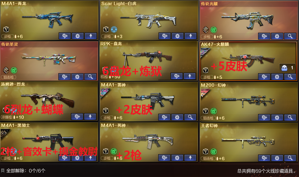 传说光耀圣灵✅6烈龙蝴蝶+6盘龙炼狱✅幻神CFS+白虎+2毁灭带2皮✅火麒麟带5皮+雷神2皮