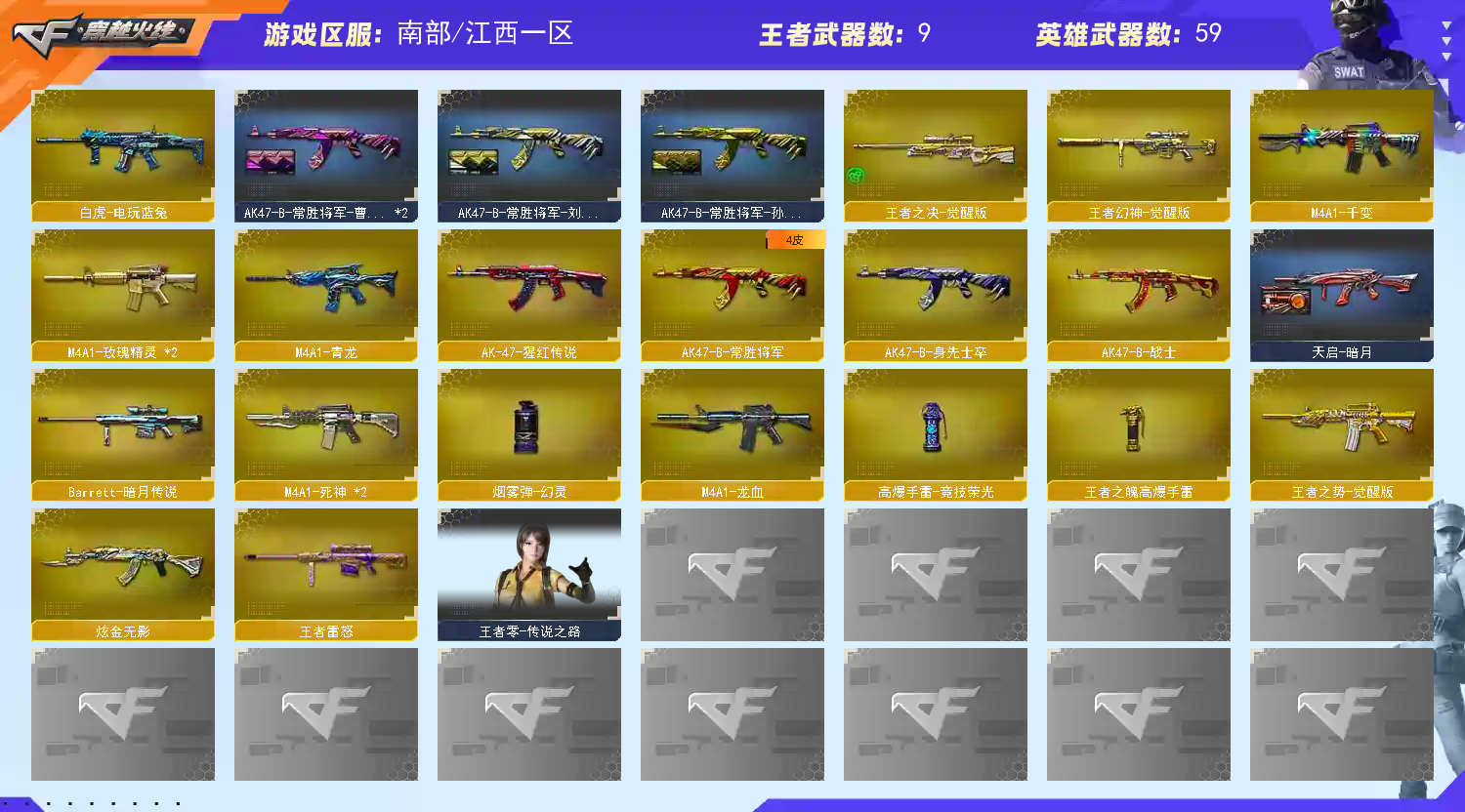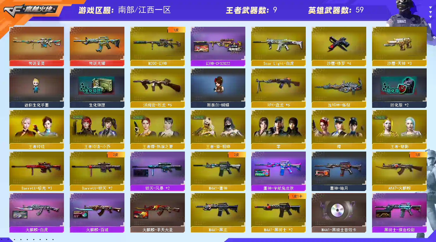 传说光耀圣灵✅6烈龙蝴蝶+6盘龙炼狱✅幻神CFS+白虎+2毁灭带2皮+火麒麟带5皮 稀有武器:传说光耀、传说圣灵、M200幻神(CFS2022皮肤)、烈龙X6+斯泰尔蝴蝶、盘龙X6+炼狱、SL白虎、M4青龙、千变、火麒麟(白虎皮肤、平天大圣皮肤、百城皮肤、AG战队皮肤、雷神皮肤)、黑龙、雷神(宇航兔皮肤、暗月皮肤)、黑骑士X2(音效卡、摸金教尉皮肤)、死神X2、龙血、玫瑰精灵X2、烈火X2、白虎电玩蓝兔、毁灭X2(风暴皮肤、CFS2018皮肤)、极光X3、暗月传说、修罗X4、天神X3、屠龙、龙啸、擎天X5、麒麟刺 稀有角色:零、樱、王者葵貂蝉 (四防:减少闪光效果+免疫队友炸弹伤害+减少掉落伤害+副武器自动装弹)、王者魅影(四防:生化背包变更+捕食者之眼+生化觉醒狂暴化+佣兵觉醒无需换弹)、王者玲珑、王者玲珑小乔(四防)、王者樱热浪之夏、修道士、暗夜X、奥摩X、陈龙野Z、初恋灵狐、反省审判长、风暴女、灵狐者职业经理(绝迹语音包) 、职业选手 王者炫金武器:王者幻神、王者雷怒、王者之势、王者之决、王者之锋、王者之啸、王者之击、王者之刺 投掷套装:高爆手雷竞技荣光、烟雾弹幻灵、王者之魄高爆手雷、双生雷恶棍、音乐手雷X2 小人枪武器特殊武器:暴君乱世超越MAX、冰龙粉碎者白马银枪、激光毁灭者、神圣爆裂者末日、阐释者、斯泰尔蝴蝶、海滩汪汪巴雷特、猫猫手套、迷你生化手雷;RPK-盘龙,M200-幻神,Scar Light-白虎,
