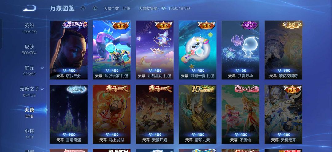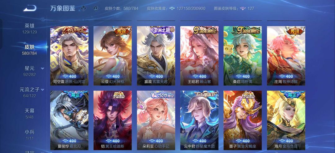 v10、537皮6水4无双、安琪拉-颠倒童话·魔镜、朵莉亚-神骥、遇见神鼓、齐天大圣、白虎志、韩信荣耀典藏、73传说、时之魔女、瑶无双、青丘、九尾、神器明辉仪