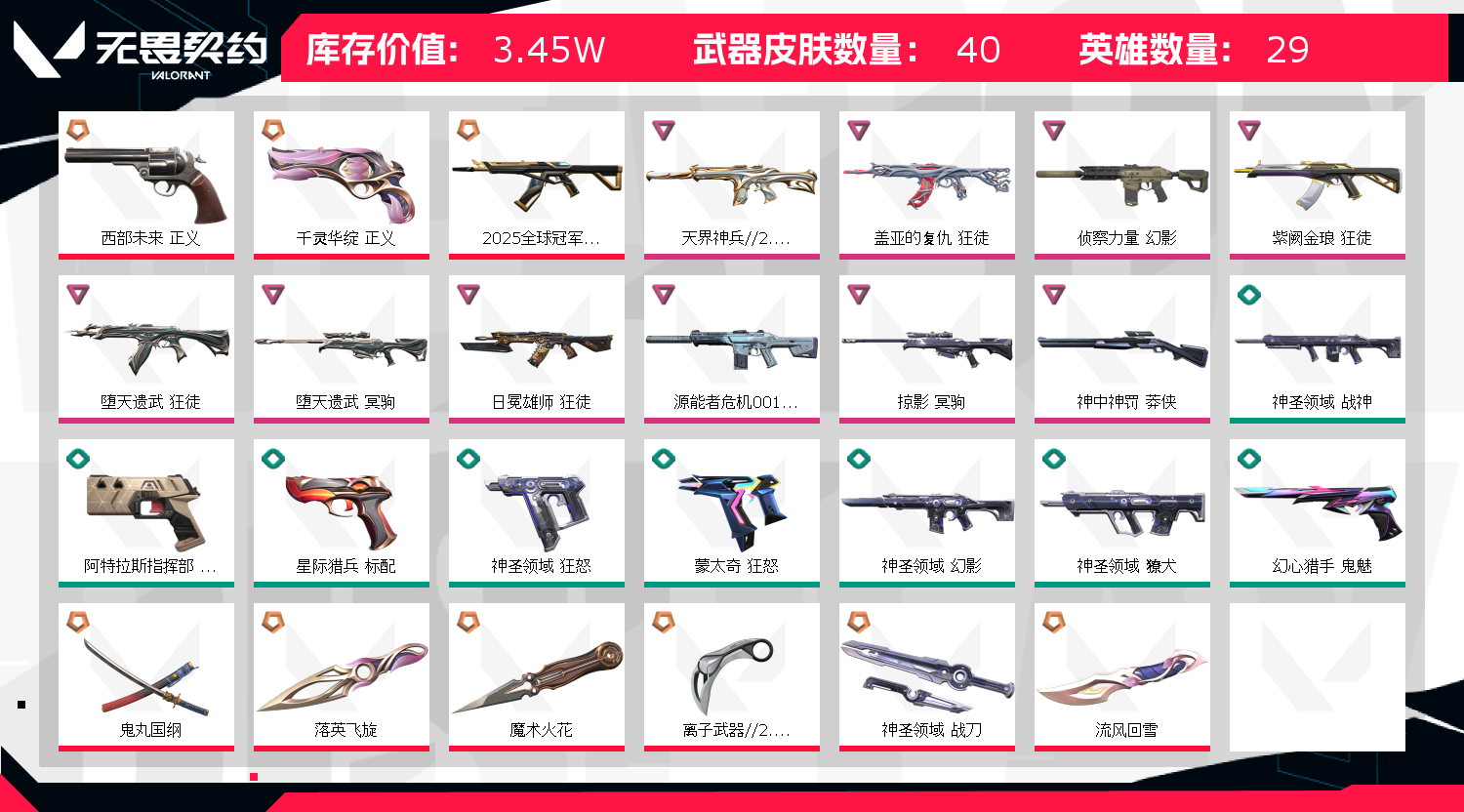 首页 > 租号大厅 > 无畏契约-wegame > wegame/wegame > 🔥25冠军狂徒🔥盖亚紫金堕天遗武日冕雄狮狂徒+侦查天界源能者幻影+鬼丸落英流风魔术火花+堕天大狙