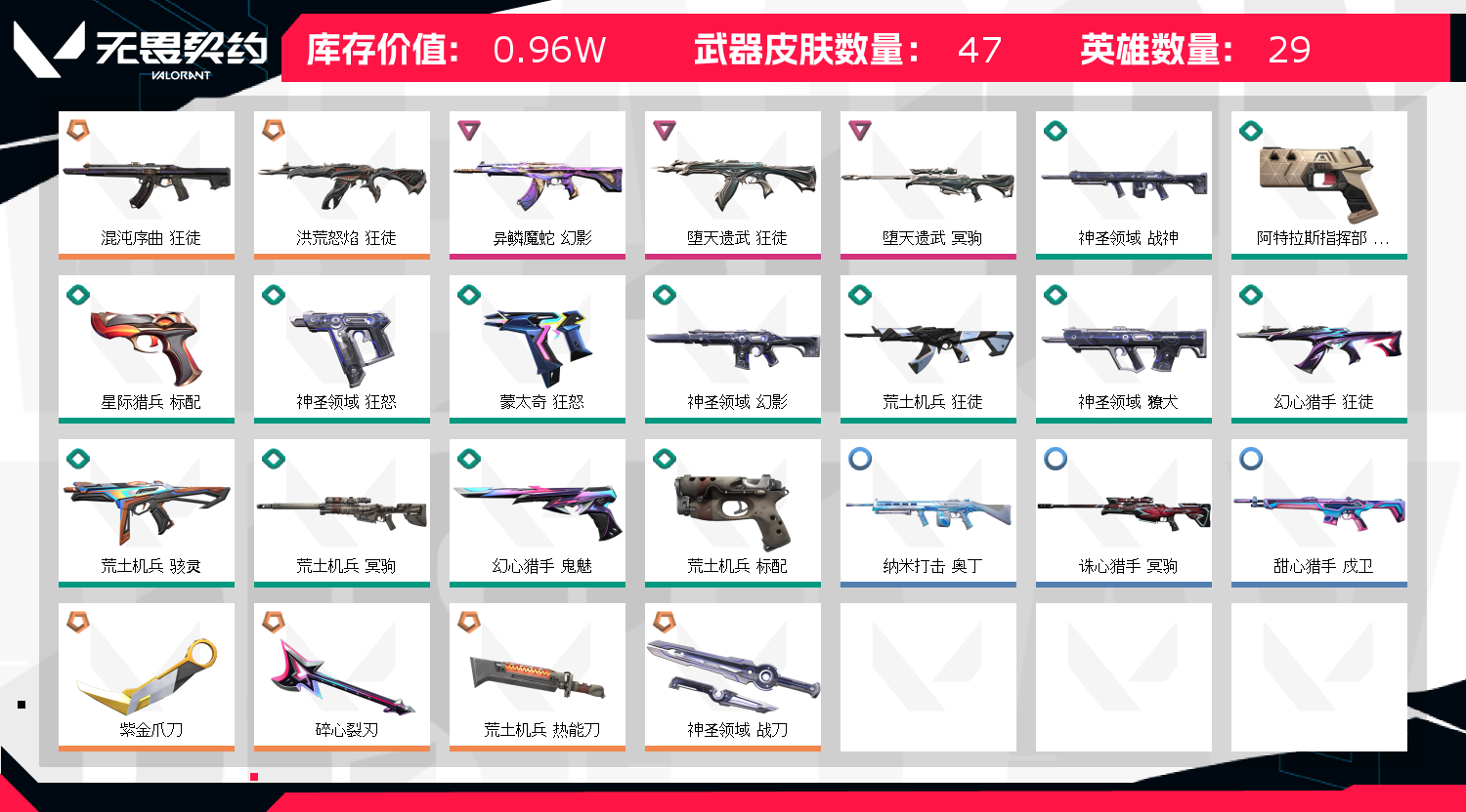 【禁赛全网拉黑 炸鱼轻点】 注意事项:出现冻结,请点击协助处理,我们看到后会及时解冻。等5-10分钟重新登陆即可 郑重声明:若出现 账号封禁/毁号等情况,本人商户多年,所属账号已在派出所备案,经过网络财产备案价值! 使用外挂脚本导致游戏账号封禁直接向平台提取ip地址!一经发现直接报警处理立案追责,根据账号价值追究其法律责任! 请租客文明游戏,不要开挂或挂机!切勿心存侥幸!因无畏契约检测严格,为防止后台插件导致封号,上号前请务必重启电脑! 1.登陆界面稍等2分钟会上去(自动登录)老板不要着急,一次不行多来几次wegame界面要耐心等2分钟 2.密令会自动输入如果一次不成功多来几次。 3..进入wegame后到弹短信验证处,关闭掉,重新下载无畏契约这个游戏即可成功上号,记住。这个方法百分百上号成功!就是进入wegame重新下载无畏契约游戏 !!!百分百成功!! 4.请及时续租不要挂机,如果不需要续租了,临近结束不要再开赛,所以请及时续租,导致禁赛的一律拉黑 。 5.祝老板玩的愉快,喜欢可以收藏关注;紫金爪刀,洪荒怒焰 狂徒,异鳞魔蛇 幻影,堕天遗武 狂徒,混沌序曲 狂徒,堕天遗武 冥驹,