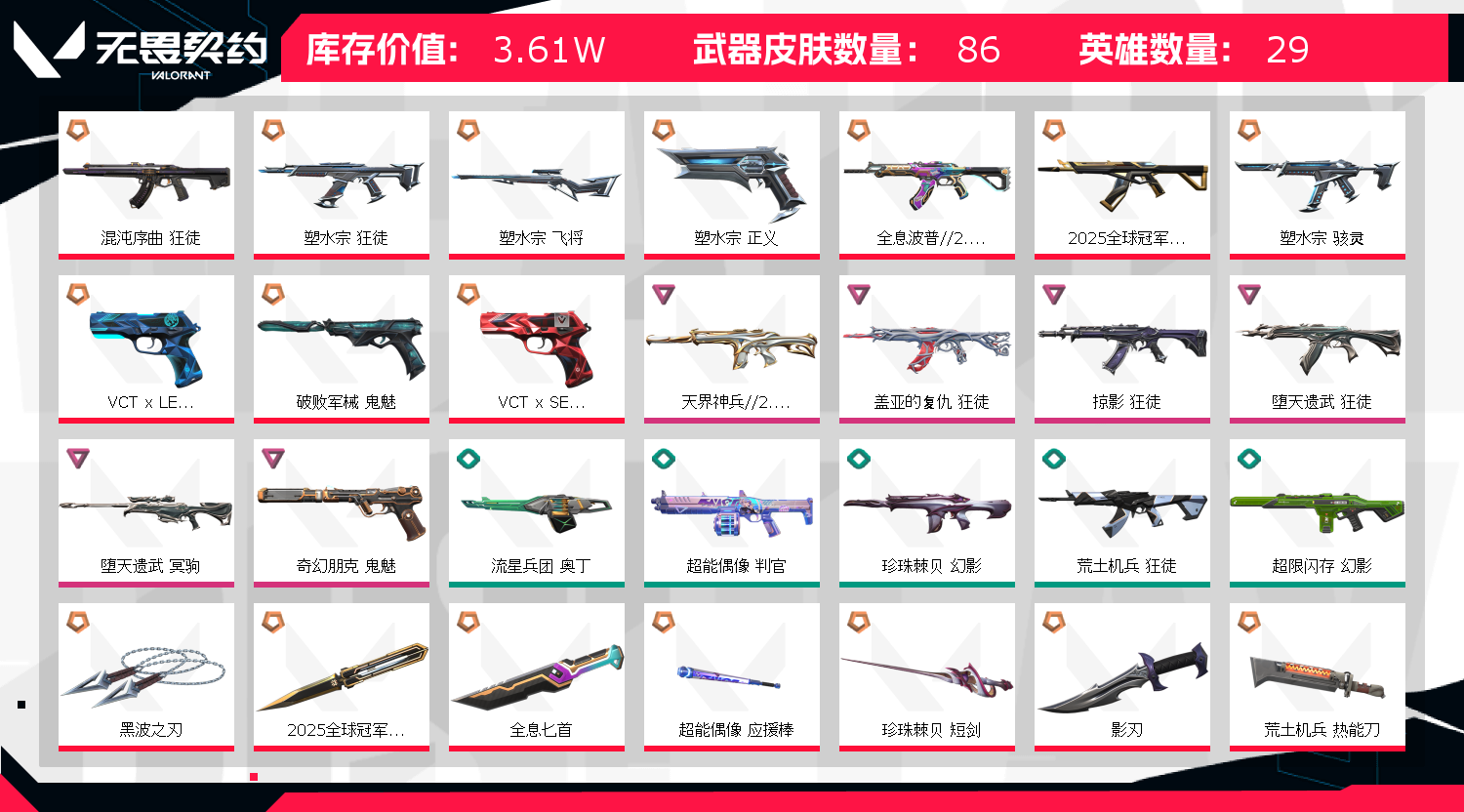 首页 > 租号大厅 > 无畏契约-wegame > wegame/wegame > 可排⭐️V25/9四个赋能挂饰⭐️25冠军套⭐️塑水套⭐️混沌盖亚堕天掠夺狂徒⭐️影刃全息匕首