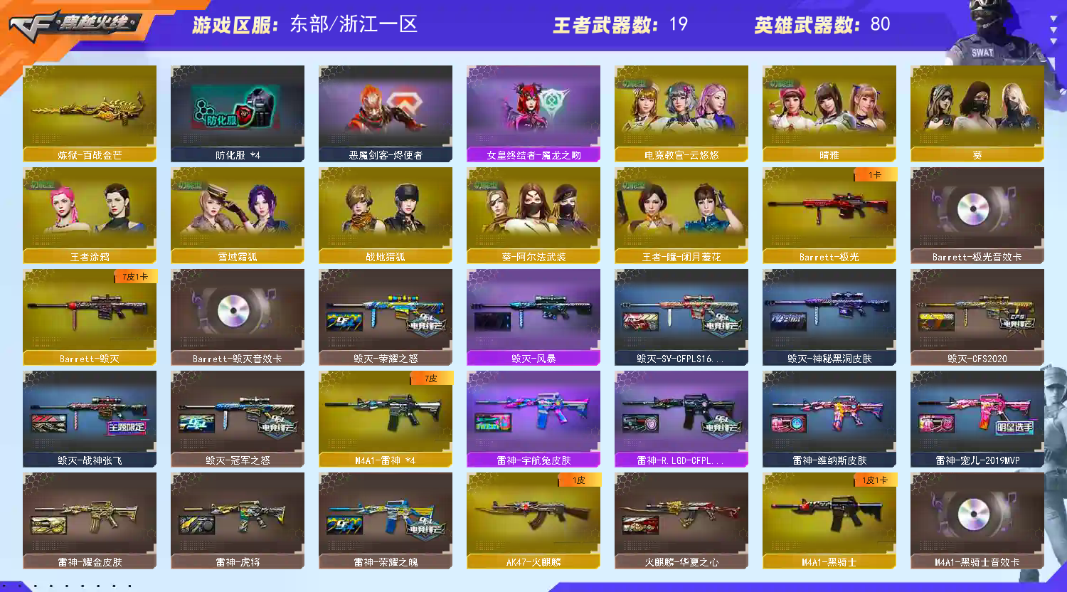 编号:ZJ308东部浙江一区✅爆破生化✅四防云悠悠+幻神5件套+6烈蝴蝶+炽芒蝶刃✅裁决4件套+7把柯尔特+竞技荣光套✅ 稀有武器:M200幻神X2、M200竞技荣光、烈龙X6+斯泰尔蝴蝶、火麒麟、雷神X2、黑骑士、M4A1武圣、M4A1青龙、SCAR白虎、黑武士锦绣游龙、超新星热带奇洋、HK417朱雀电竞之星、天罚斗烈龙驹、源火麒麟、QBZ金色蔷薇、烈火、毁灭、极光、裁决、Barrett朱雀、源毁灭、荣耀世冠火麒麟、暗月传说、炼狱百战金芒、雷霆、修罗X3、天神X2、Glock武圣、USP雷暴、柯尔特竞技荣光、天神动感闪耀、柯尔特无冕之王X2、柯尔特电竞之星、荣耀世冠柯尔特、柯尔特冠军之特、柯尔特荣耀世冠EP、屠龙、幻灵之锋、擎天竞技荣光、炽芒蝶刃、屠龙动感闪耀、龙啸热带奇洋、龙啸云海游龙、麒麟刺百战金芒、屠龙电竞之星、屠龙斗烈龙驹、M4A1再燃战线、AK47再燃战线、Knife冠军之刃 稀有角色:四防电竞教官云悠悠(减少掉落伤害/减少闪光效果/免疫队友炸弹伤害/副武器自动装弹)、葵、晴雅、零纪元、战地猎狐、斗烈龙骑、幻面灵狐、葵阿尔法武装、奇洋探员、乔伊教练、王者瞳闭月羞花、王者涂鸦、修道士、雪域霜狐、暗夜X、灵狐者黄金海岸 音效卡:M200幻神音效卡、黑骑士音效卡、极光音效卡、毁灭音效卡、QBZ金色蔷薇音效卡、裁决音效卡、炼狱百战金芒庆典舞曲音效卡、HK417朱雀电竞之星竟星悦动音效卡、白虎音效卡、屠龙电竞之星竟星悦动音效卡、屠龙斗烈龙驹音效卡、天罚斗烈龙驹音效卡 稀有皮肤:幻神周瑜皮肤/KZCFPLS25冠军皮肤/星火小队签名臻藏版皮肤 QBZ金色蔷薇冠军之薇皮肤/传奇宠儿皮肤 裁决叶芒苍灵皮肤/流光秘银皮肤 黑骑士白马银枪皮肤/破浪10年皮肤 毁灭冠军之怒皮肤/英雄计划皮肤/荣耀之怒皮肤/SVCFPLS16冠军皮肤/百城浙江皮肤/CFS2020皮肤/神秘黑洞皮肤/风暴皮肤/战神张飞皮肤 雷神宠儿2019MVP皮肤/荣耀之魄皮肤源计划2.0专属皮肤/RLGDCFPLSS18冠军皮肤/耀金皮肤/虎将皮肤/维纳斯皮肤/宇航兔皮肤 修罗CFSTAR皮肤X2/能量核心皮肤 屠龙荣耀之锋皮肤/春桃皮肤 王者武器:王者沧神、QBZ王者蔷薇、王者火魄X2、王者青龙、Barrett雷霆王者、王者之击、王者之啸、炫金雷神、炫金黑龙 小人枪及特殊武器:白虎迷你小艾、火麒麟灵狐、M82水枪不败狙神、毁灭孙三炮、轻型军用手斧再燃火线、巡航者、KAC锯式机枪黑桃战神、苍雷、生存之眼X3、金刚伞、AWM灵狐15周年嘉年华、M37葵、猫猫手套 投掷武器及套装:雷暴套、幻灵套、竞技荣光套X2、音乐手雷X2、迷你生化手雷、凤凰;USP-雷暴,柯尔特-无冕之王,荣耀世冠-柯尔特,柯尔特-冠军之特,炽芒蝶刃,Knife-冠军之刃,电竞教官-云悠悠,