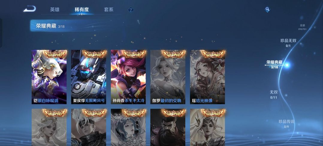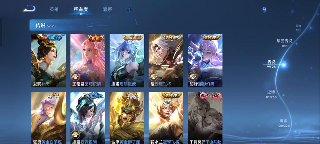 v10、537皮6水4无双、安琪拉-颠倒童话·魔镜、朵莉亚-神骥、遇见神鼓、齐天大圣、白虎志、韩信荣耀典藏、73传说、时之魔女、瑶无双、青丘、九尾、神器明辉仪