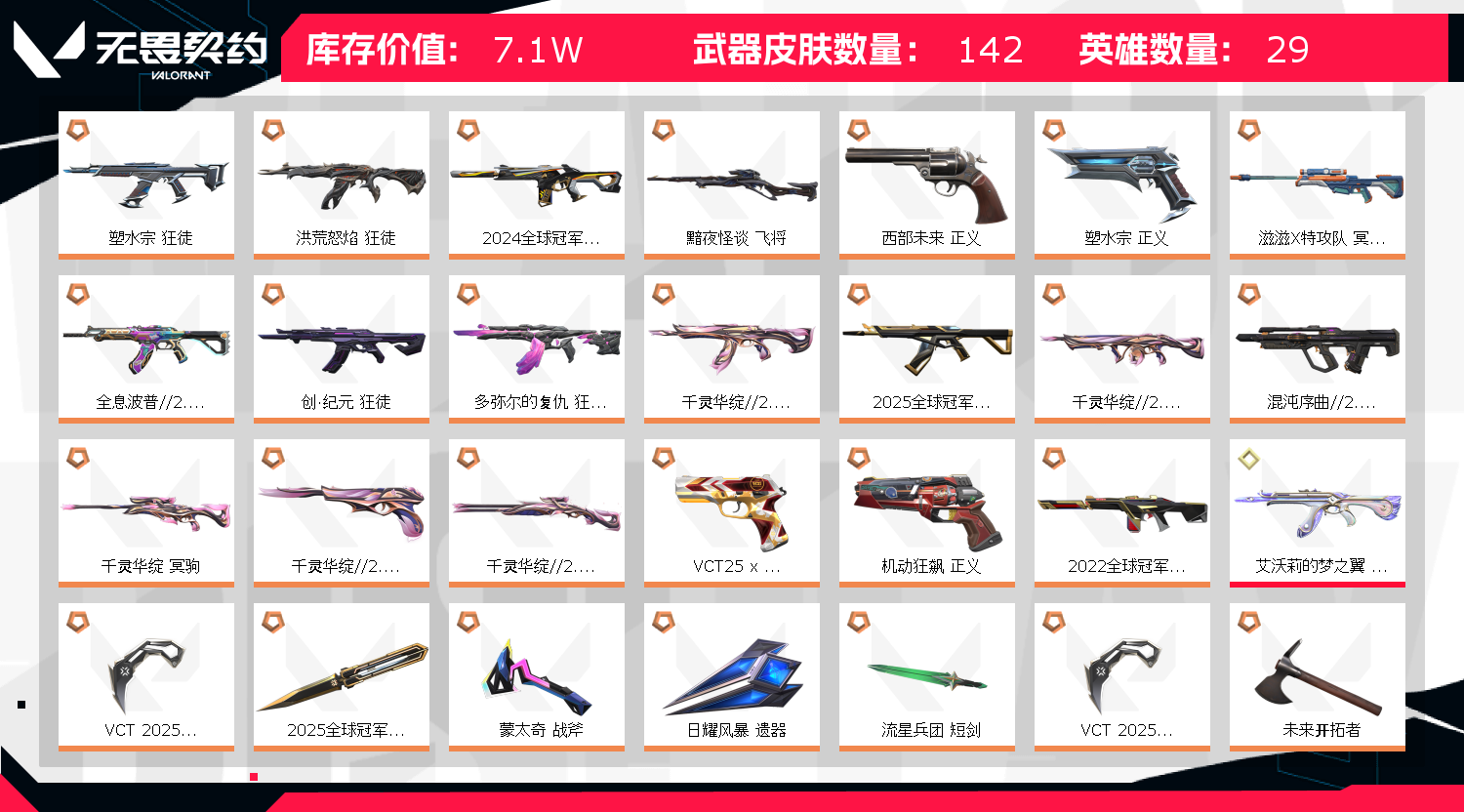 允许 英雄28 武器皮肤数量142🈲开挂🈲挂机;VCT 2025 爪刀,起源 雄鹿,掠影 戍卫,洪荒怒焰 狂徒,塑水宗 狂徒,2024全球冠军赛 幻影,黯夜怪谈 飞将,