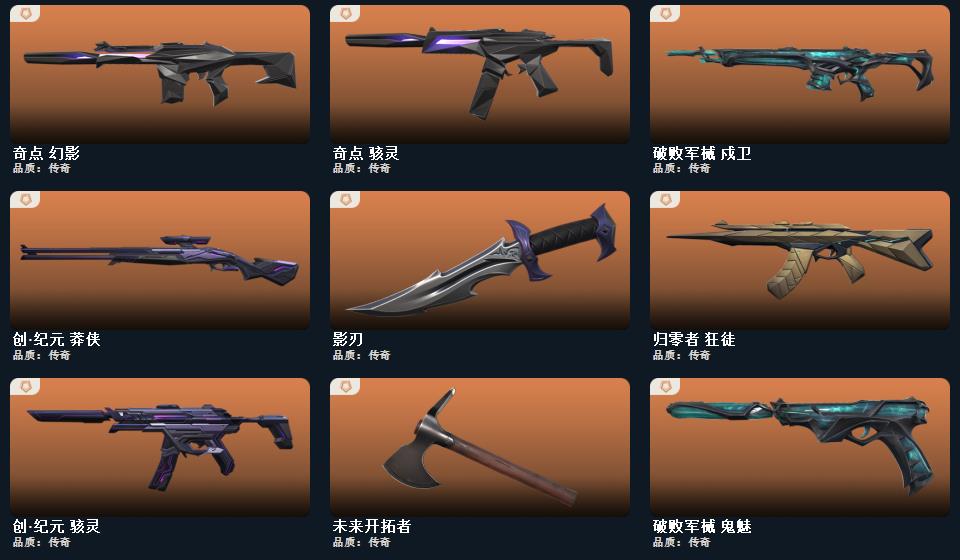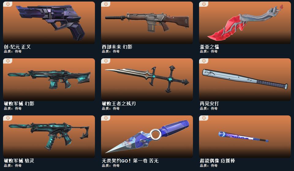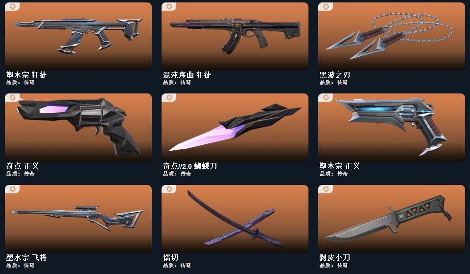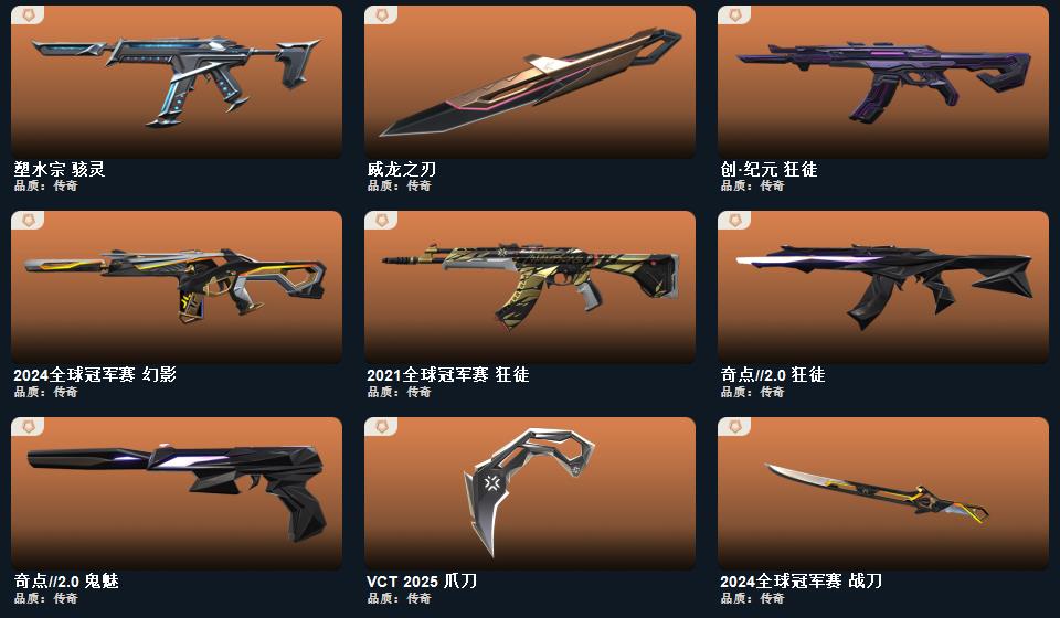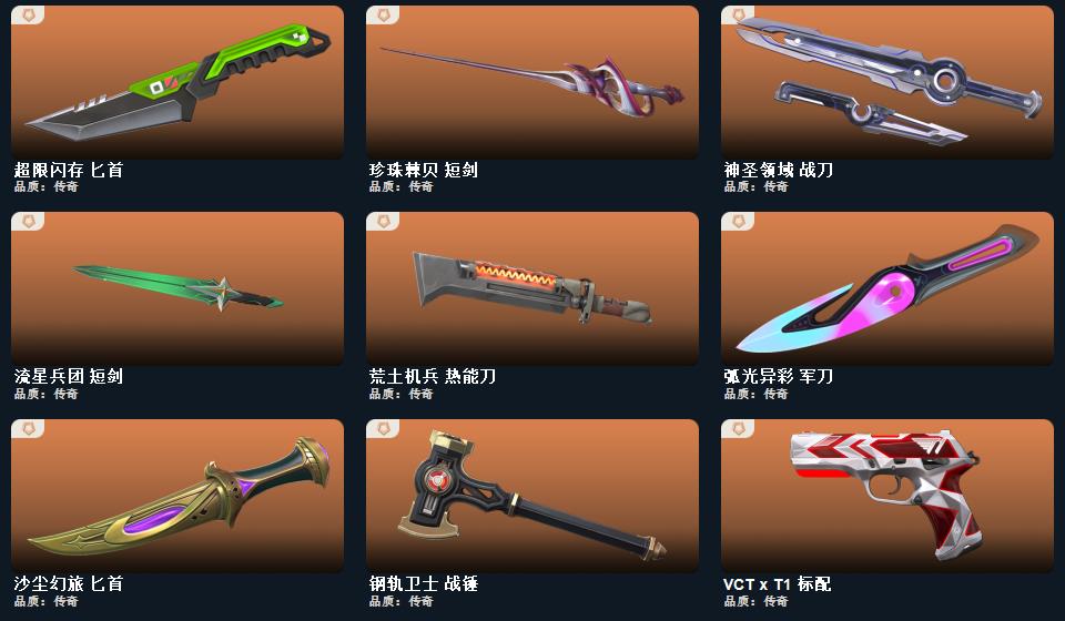 创纪元套装,破败军械套装,塑水宗套装,奇点2.0套装,2024全球冠军赛套装,耀鳞威龙套装,掠影套装 近战武器-2024全球冠军赛战刀,近战武器-闪耀之星荧光棒,近战武器-剥皮小刀,近战武器-超限闪存匕首,近战武器-VCT2025爪刀,近战武器-奇点2.0蝴蝶刀,近战武器-威龙之刃,近战武器-盖亚之愠,近战武器-沙尘幻旅匕首,近战武器-影刃,近战武器-再见安打,近战武器-破败王者之残刃,近战武器-无畏契约go第一卷苦无,近战武器-钢轨卫士战锤,近战武器-弧光异彩军刀,近战武器