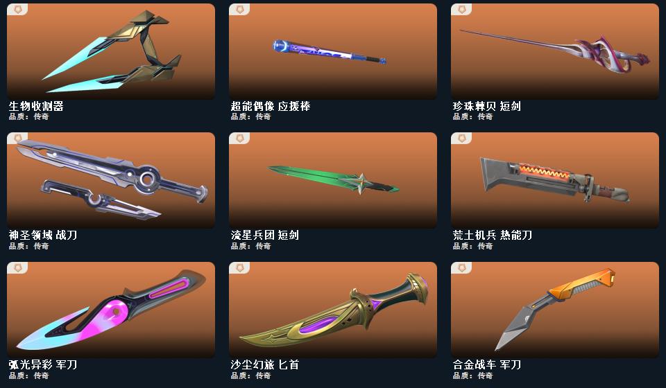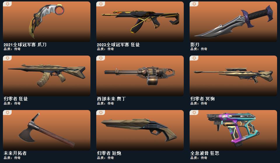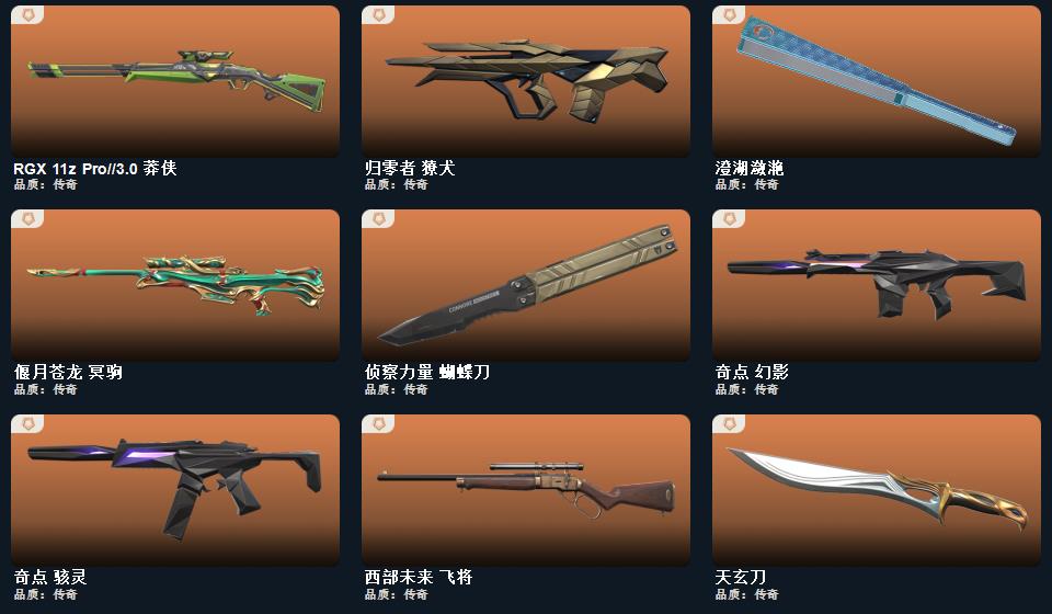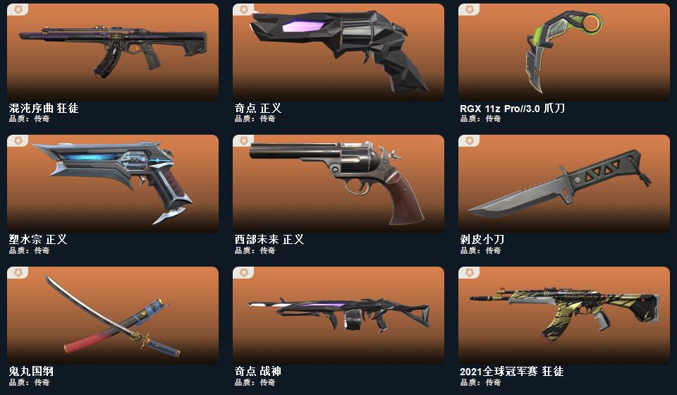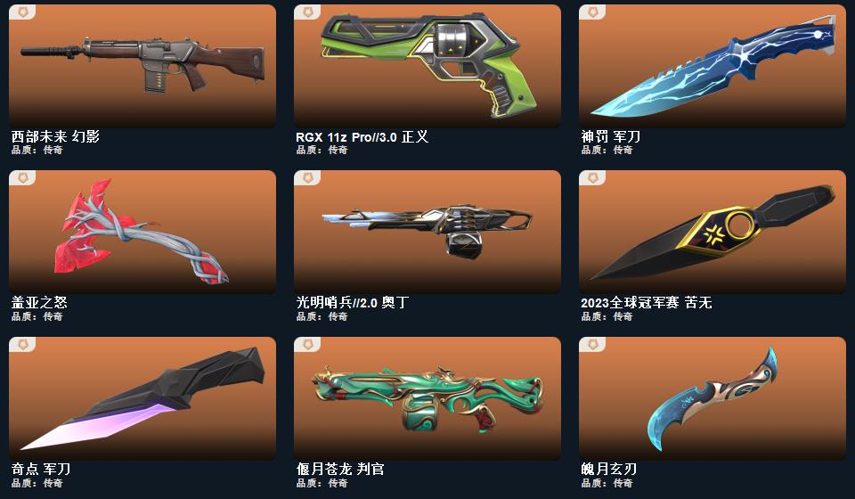西部未来套装,般若假面2.0套装,2023全球冠军赛套装,2021全球冠军赛套装,RGX-11z-Pro//3.0套装,归零者套装,奇点套装,天界神兵套装,盖亚的复仇套装,侦察力量套装,掠影套装, 近战武器-2023全球冠军赛苦无,近战武器-2021全球冠军赛爪刀,近战武器-显卡3.0爪刀,近战武器-闪耀之星荧光棒,近战武器-鬼丸国纲,近战武器-剥皮小刀,近战武器-澄湖潋滟,近战武器-天玄刀,近战武器-侦察力量蝴蝶刀,近战武器-沙尘幻旅匕首,近战武器-影刃,近战武器-魄月玄刃