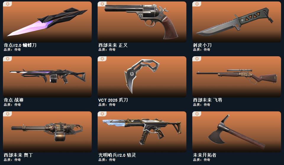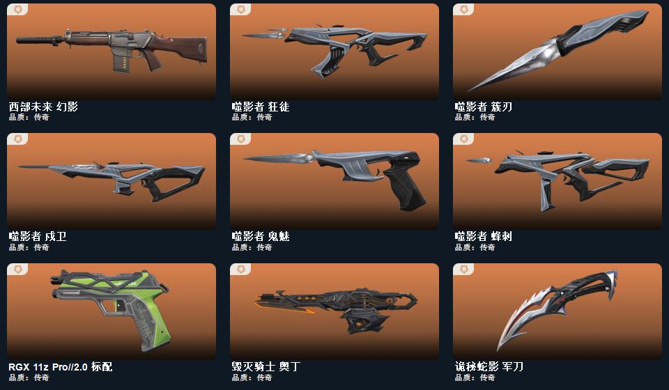 奇点战神 诡秘蛇影军刀 噬影者戍卫 噬影者狂徒 噬影者鬼魅 奇点2.0蝴蝶刀 光明哨兵2.0骇灵 西部未来幻影 西部未来飞将 艾沃莉的梦之翼 侦查力量幻影