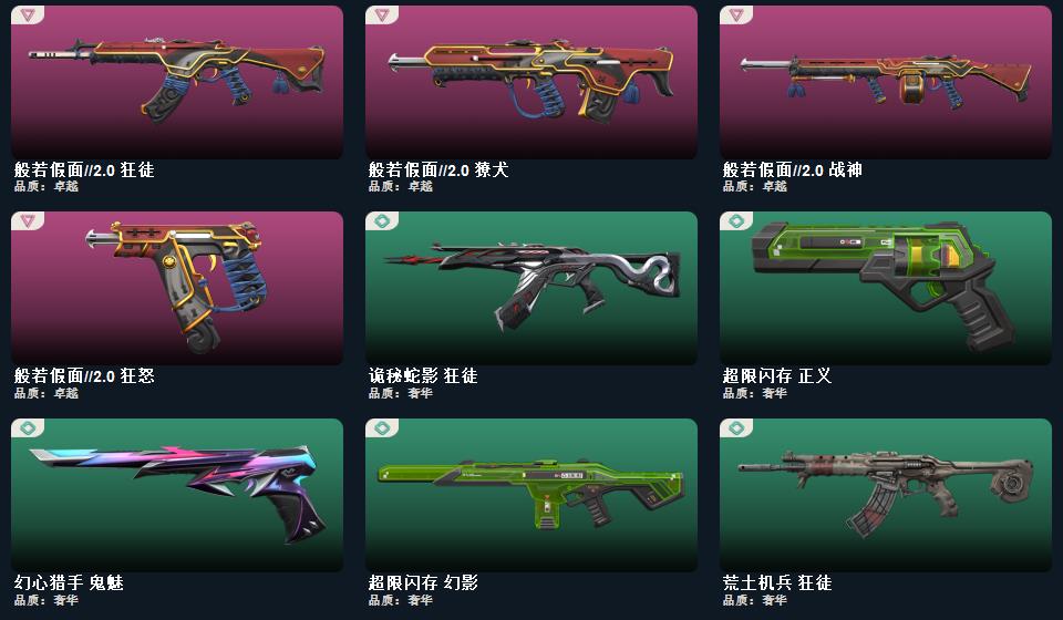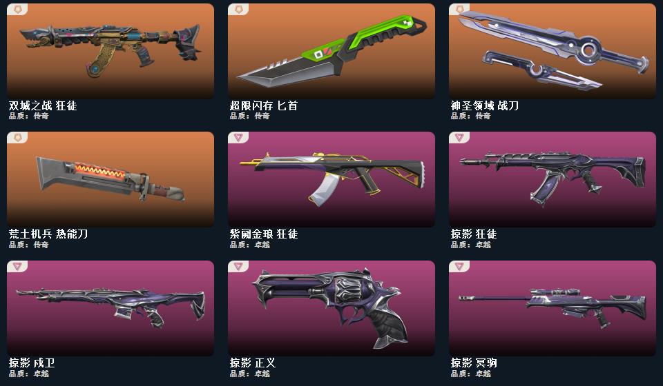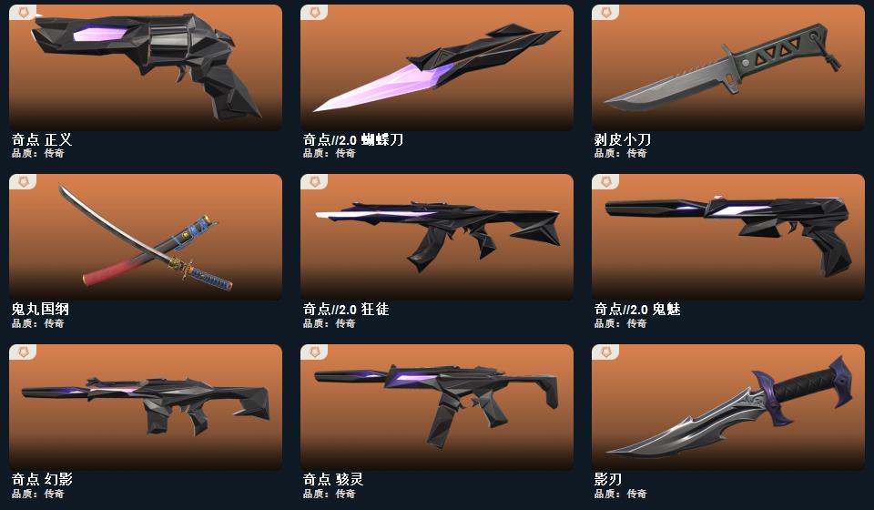 奇点2.0套装,般若假面2.0套装,掠影套装,奇点//2.0-蝴蝶刀 鬼丸国纲 影刃神圣领域-战刀,荒土机兵-热能刀,超限闪存-匕首,剥皮小刀,奇点//2.0-狂徒,奇点//2.0-鬼魅,般若假面//2.0-狂徒,般若假面//2.0-獠犬,般若假面//2.0-战神,般若假面//2.0-狂怒, 掠影-狂徒,掠影-冥驹,掠影-戍卫,掠影-正义 双城之战-狂徒,奇点-幻影,紫阙金琅-狂徒,诡秘蛇影-狂徒,神圣领域-獠犬,神圣领域-幻影,荒土机兵-狂徒,超限闪存-幻影,末日之翼-幻影