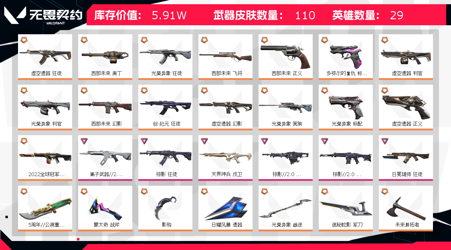 首页 > 租号大厅 > 无畏契约-wegame > wegame/wegame > 6W库/2026篆刀2022冠军颗秒刀光荣异象套虚空遗器套西部未来套掠影2.0套