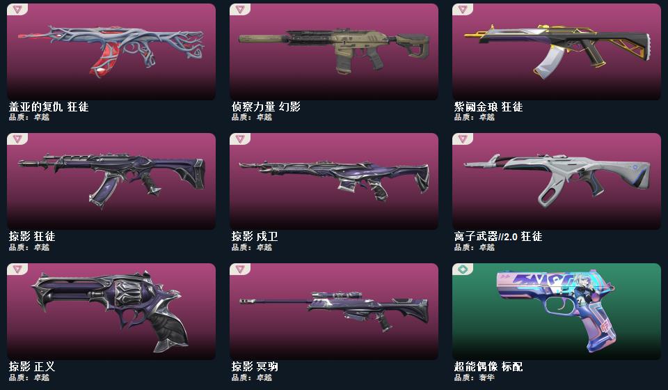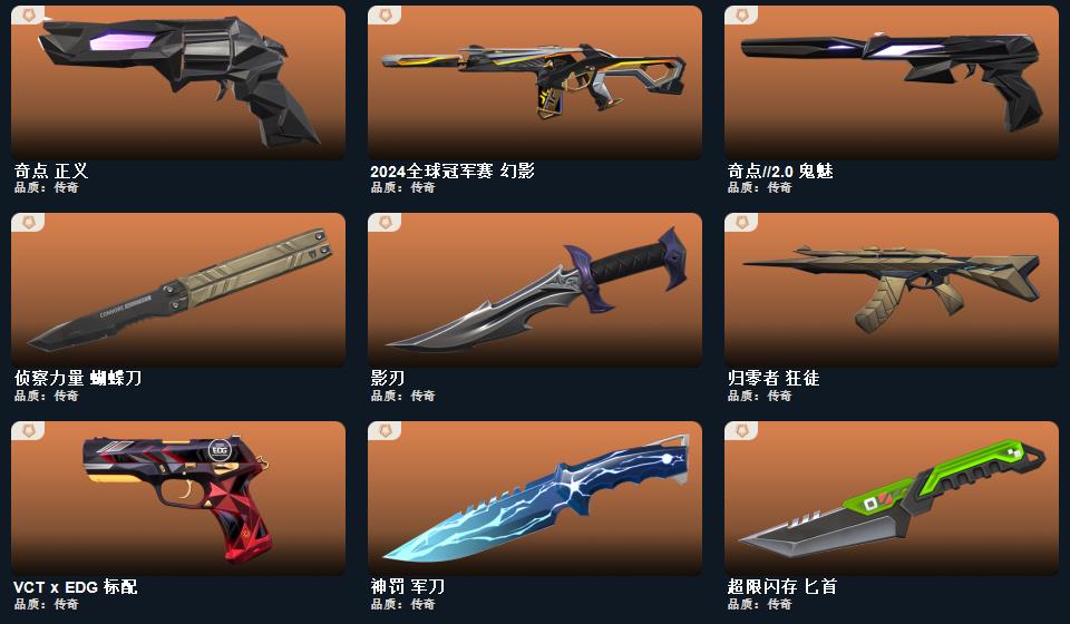 掠影套装 影刃 超限闪存-匕首,神罚-军刀,侦察力量-蝴蝶刀,掠影-狂徒,掠影-冥驹,掠影-戍卫,掠影-正义 2024全球冠军赛-幻影,归零者-狂徒,离子武器/